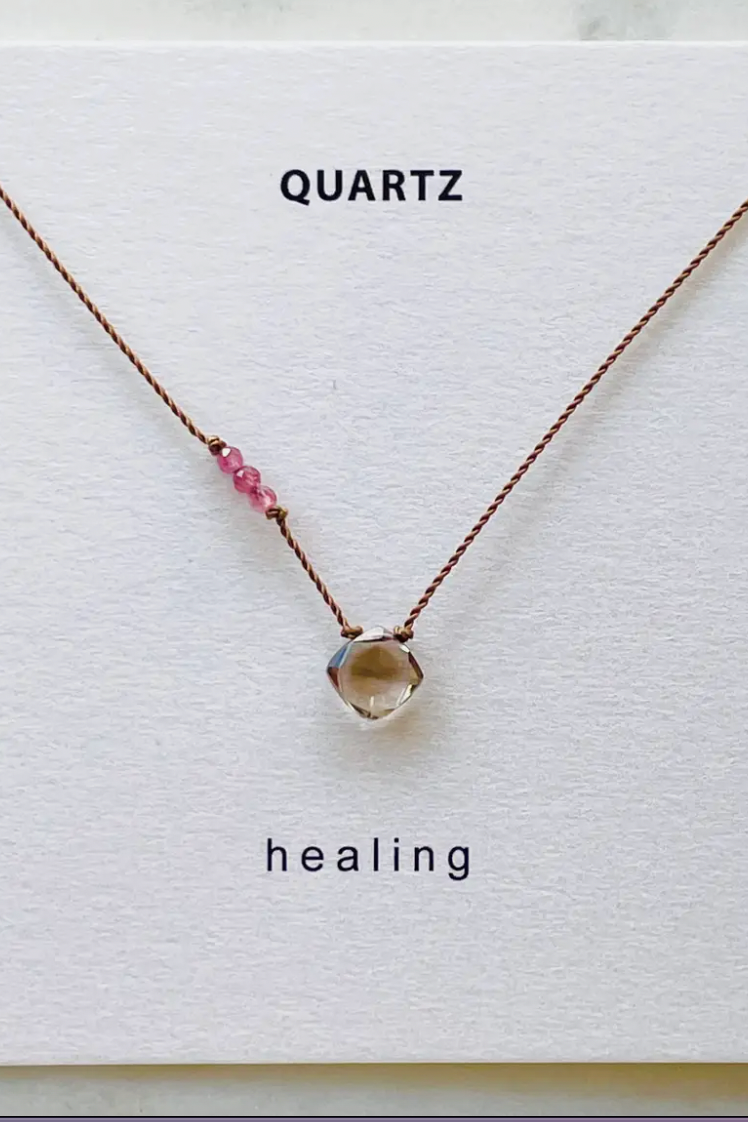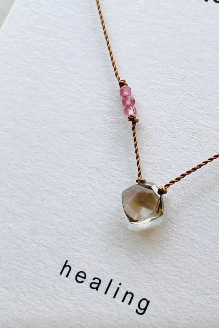 Healling necklace with a smoky quartz gemstone accented by tiny pink tourmaline beads are hand knotted on a thin, durable nylon cord. Finished with a sterling silver spring ring clasp and made to 17". Necklace comes on a pretty card with stone meaning ready for giftingor keeping.