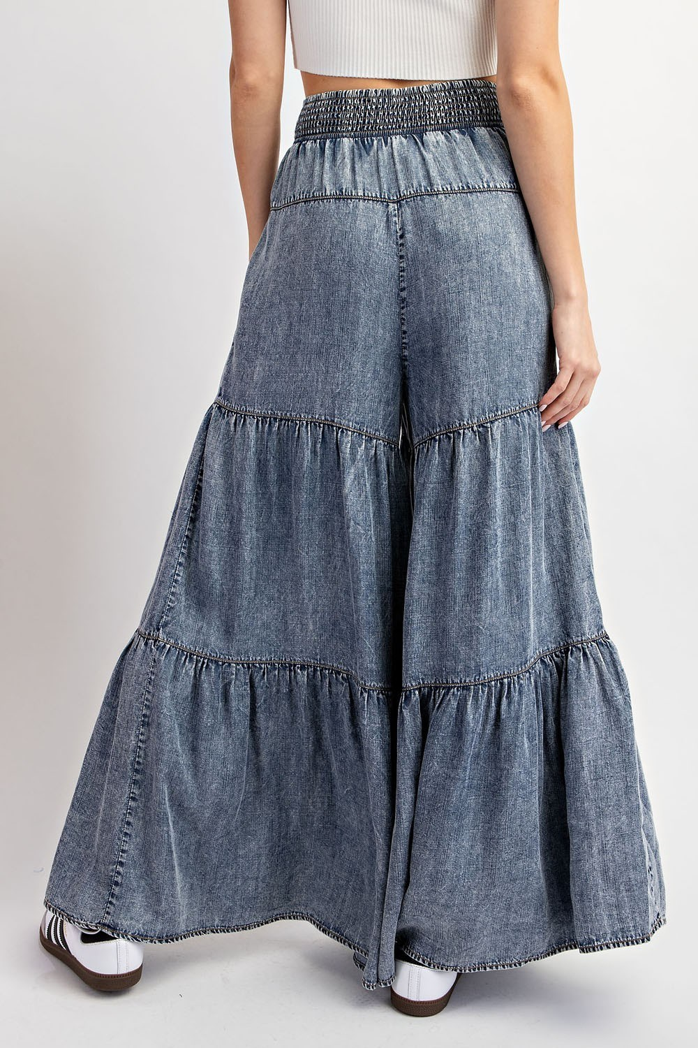 Have fun dressing up in the Snow Washed Wide Leg Pant! These pants have a smocked waistband, and each pant tiered with a flowy silhouette.