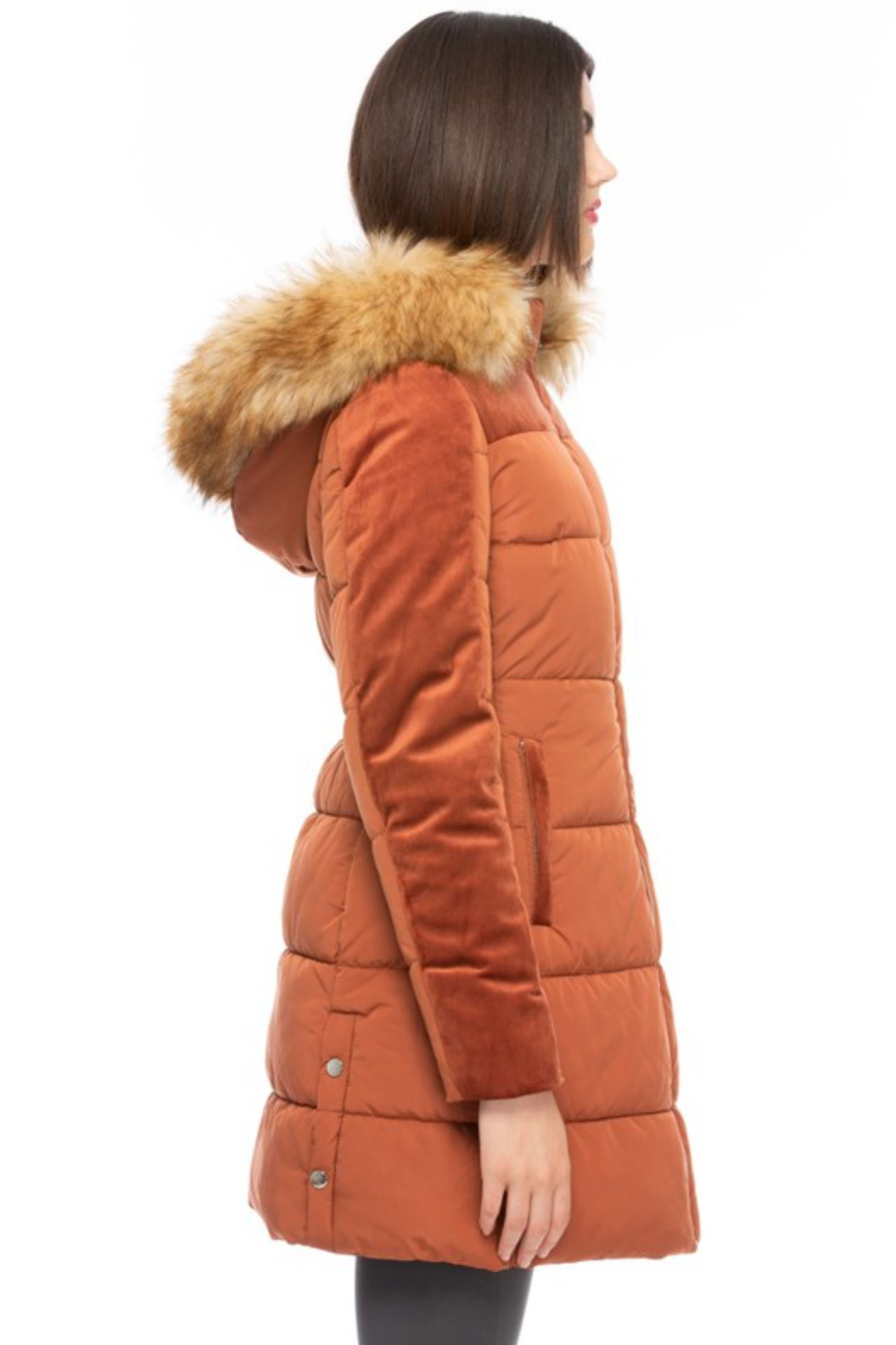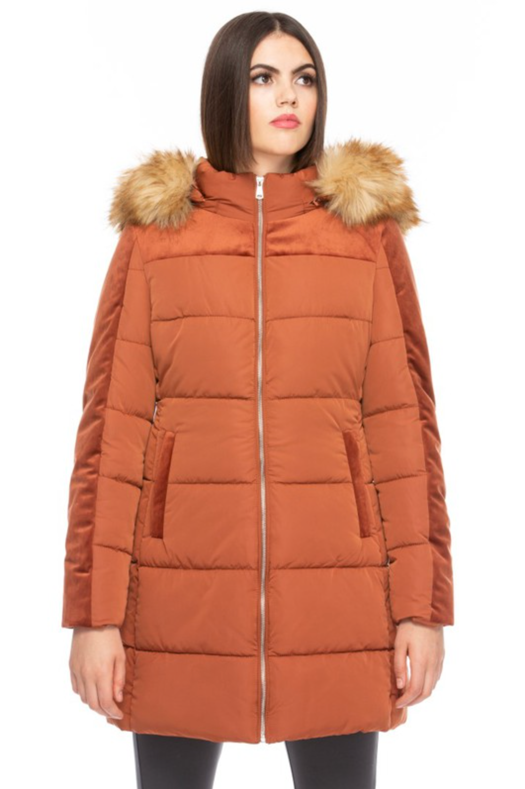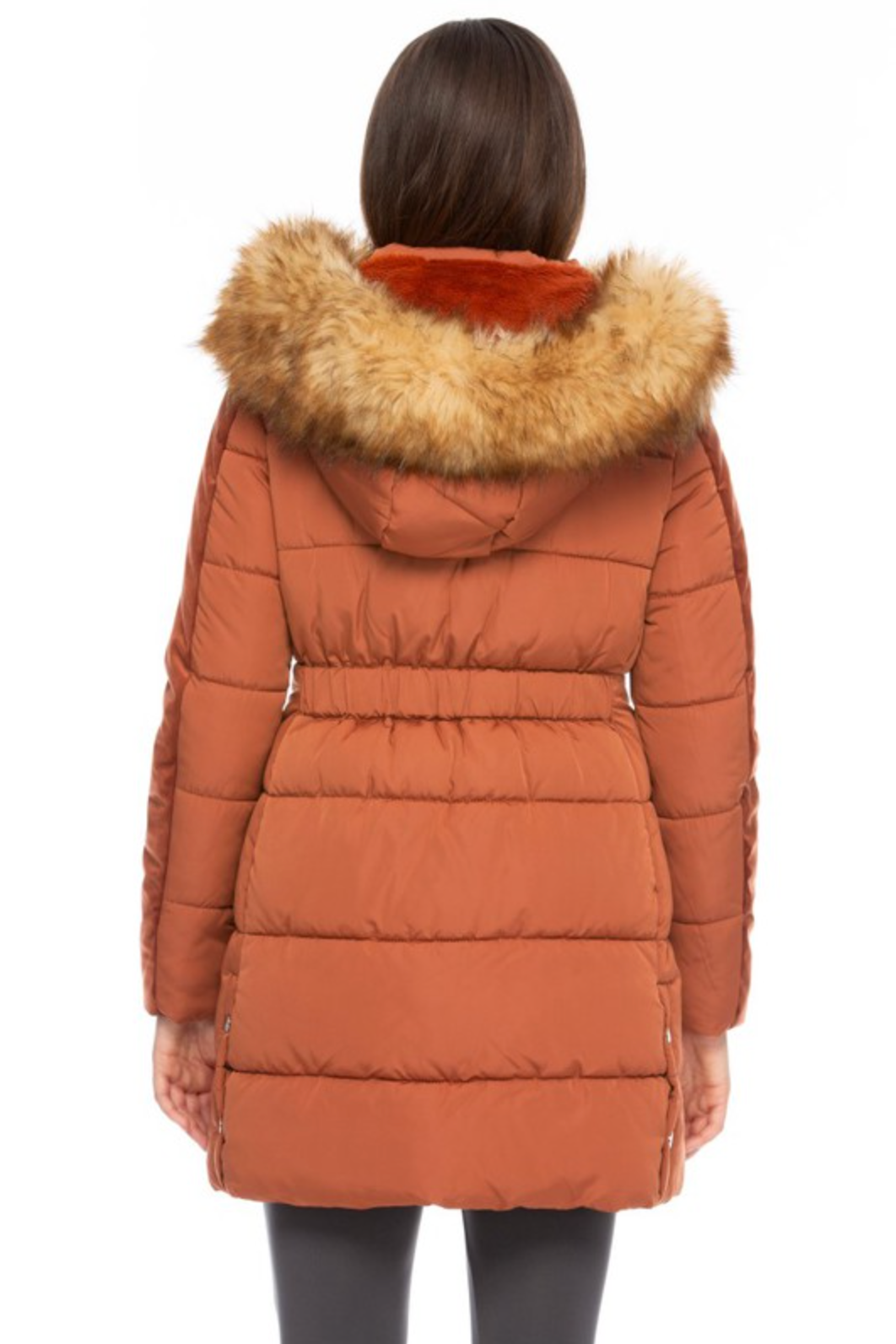Quilted puffer coat with a removable faux fur hood and trim. Has side entry zip pockets and a front zip closure.