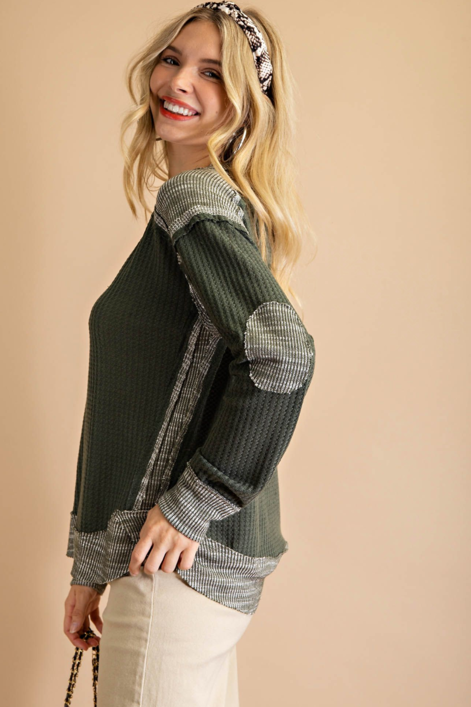Soft thermal top with 2tone contrast. Has elbow patch detail and is perfect for a cozy day out or in.