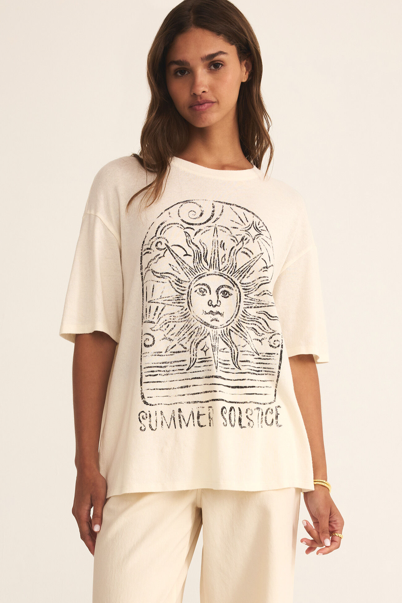 Embrace beachy vibes with this relaxed graphic tee, featuring a "Summer Solstice" sun and waves screen print. With its oversized fit and soft jersey fabric, it’s the perfect throw-on-and-go tee for wherever the sunshine takes you.