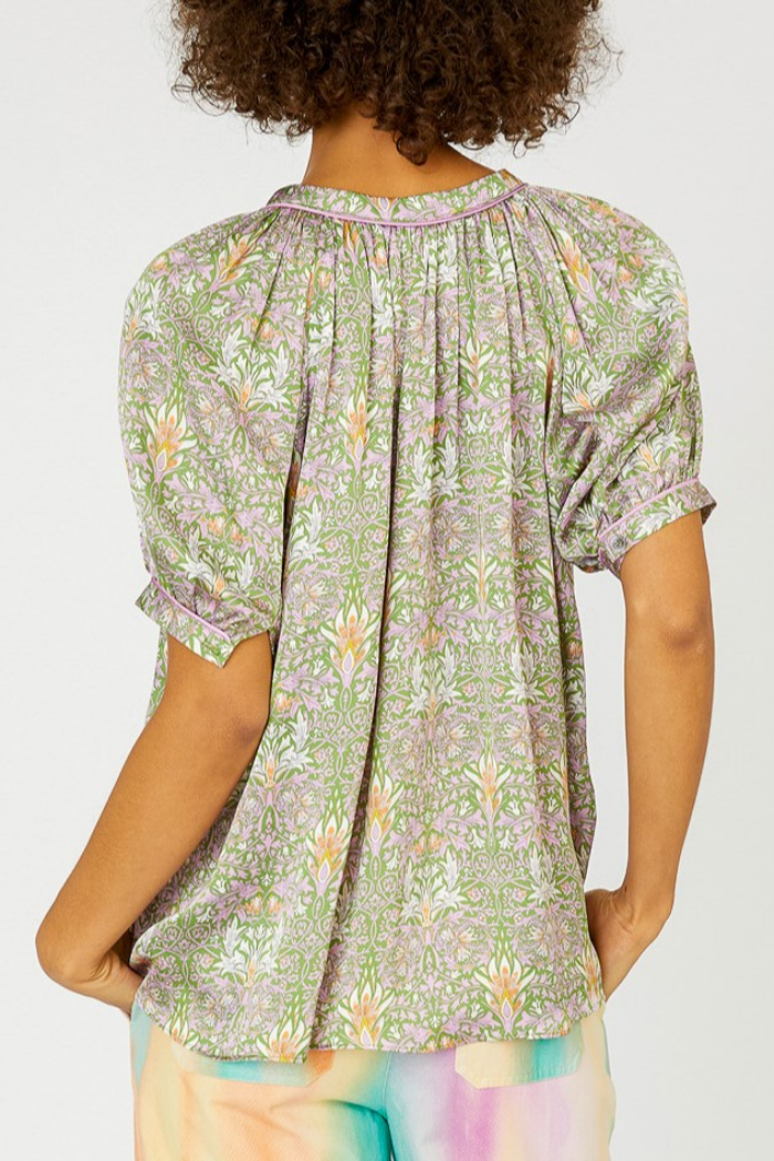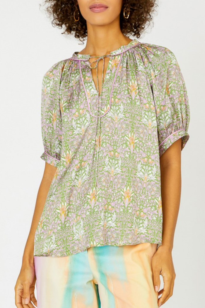 Bohemian printed short sleeve split neck blouse with placked and contrast piping