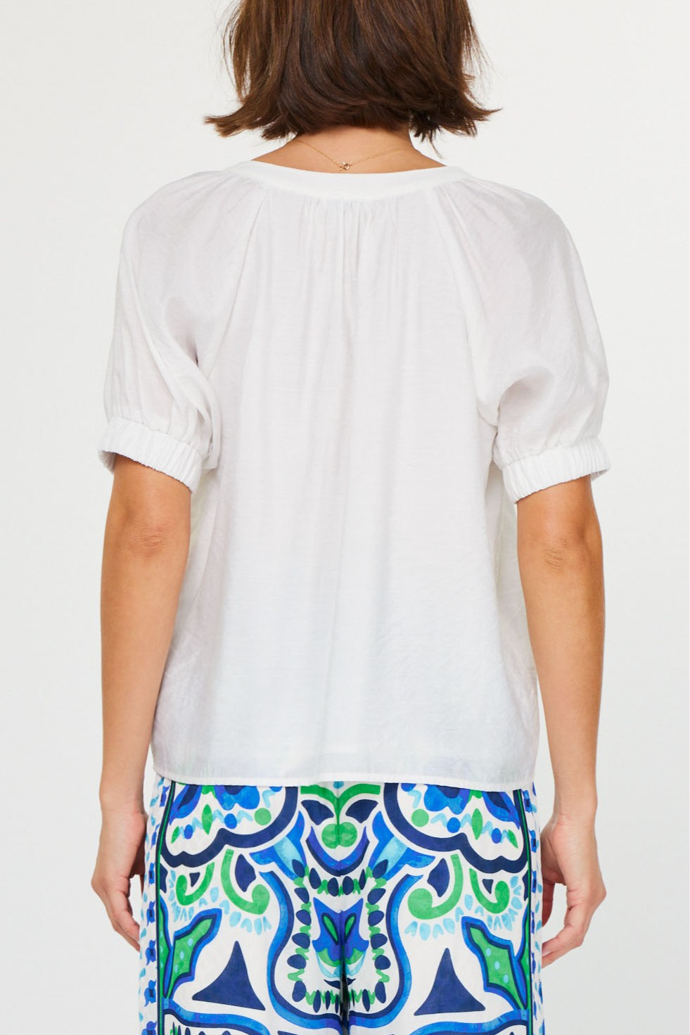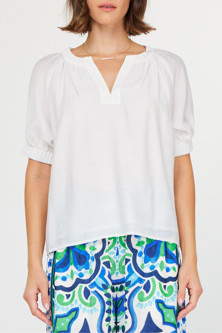 This relaxed fit blouse has a subtle v-shaped split neckline that adds a touch of elegance and modernity. The short sleeves are slightly puffed, creating a soft and feminine silhouette. The lightweight fabric drapes effortlessly, making it a versatile and comfortable choice for both casual and semi-dressy occasions.