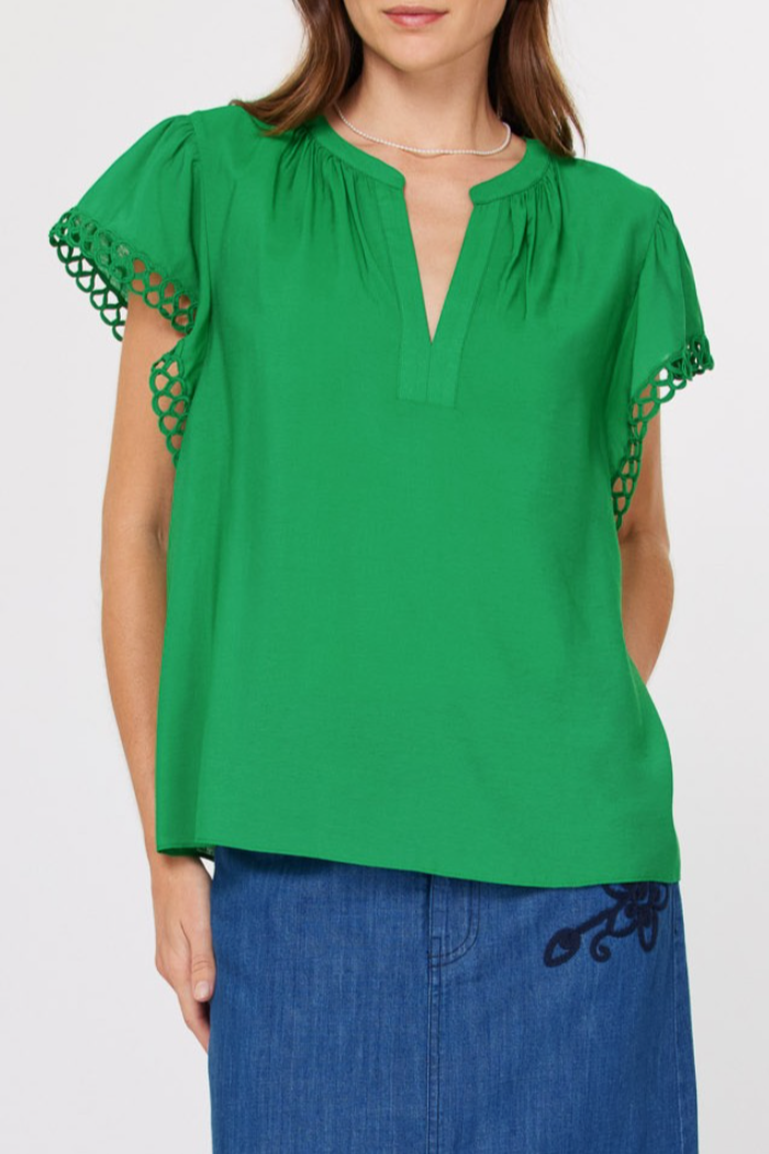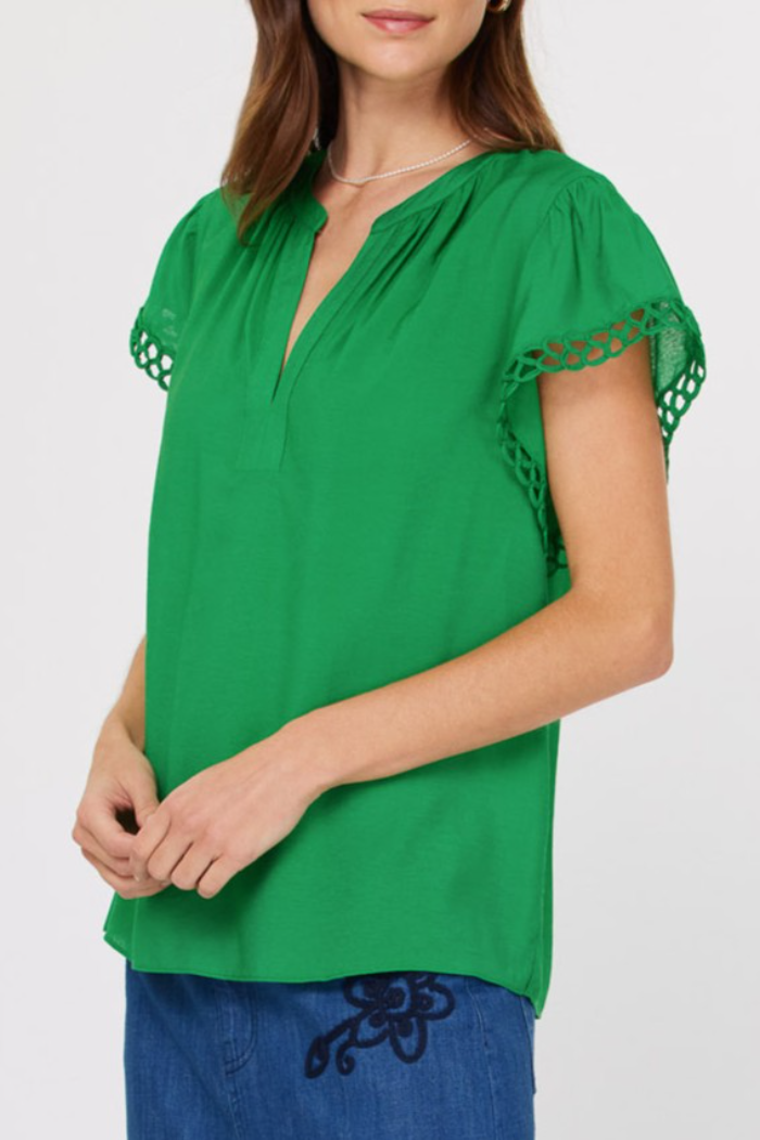 Mandarin collar, with embroidery detail on the sleeve. Fun flowy top perfect for any occasion.