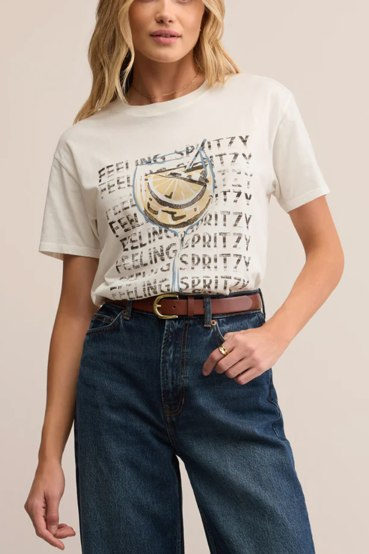 Casual, cool, and ready for fun, this laid-back tee brings the vibes with a "Feeling Spritzy" screen print and a playful cocktail graphic. Made from soft 100% cotton jersey with an easy, relaxed fit, it's a tee you'll reach for season after season.