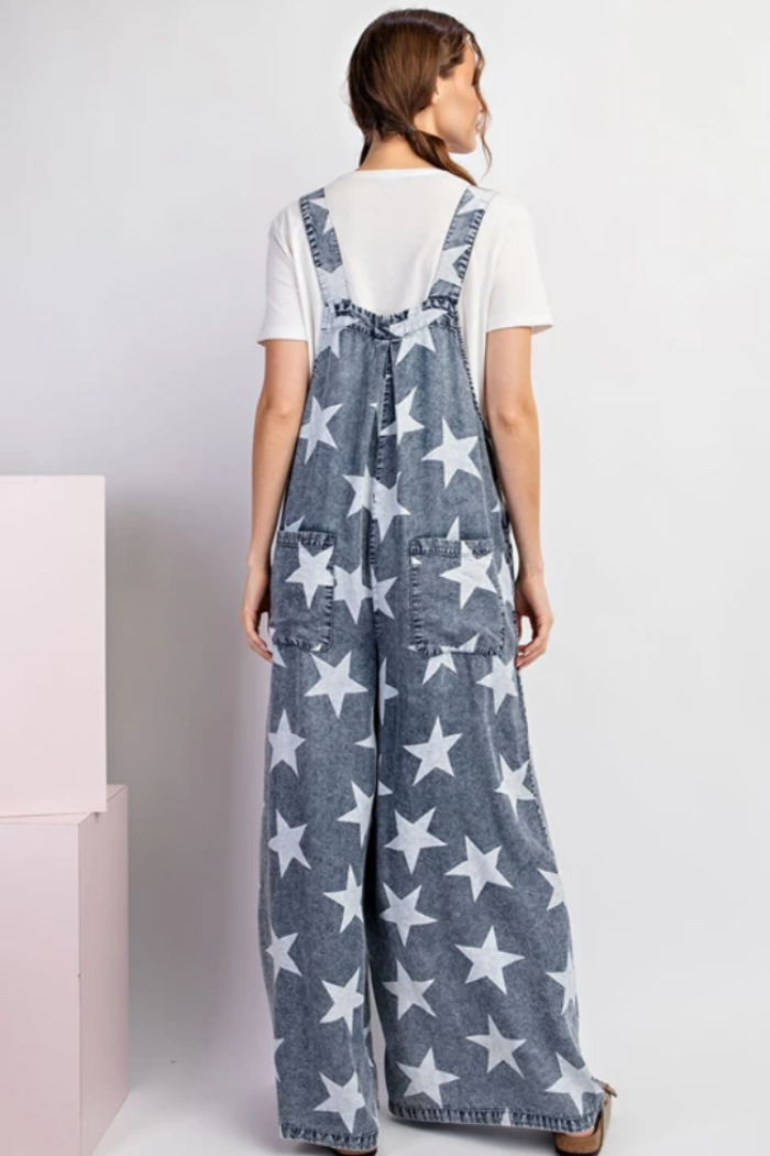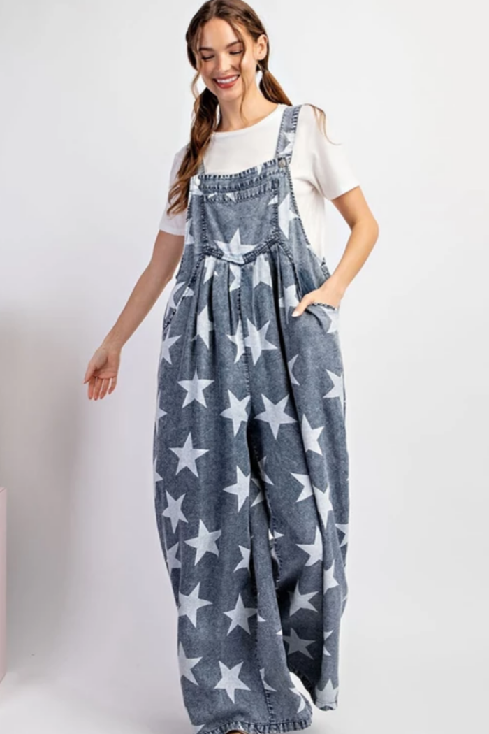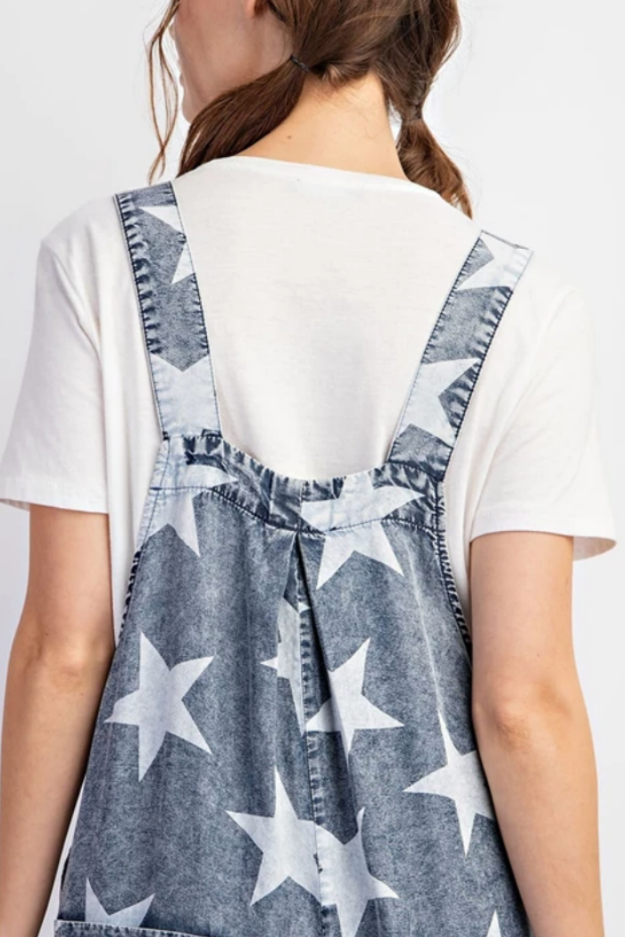Complete your summer wardrobe with a pair of fun overalls! These star print overalls are comfortable yet stylish with the printed design as well as a more loose fit.