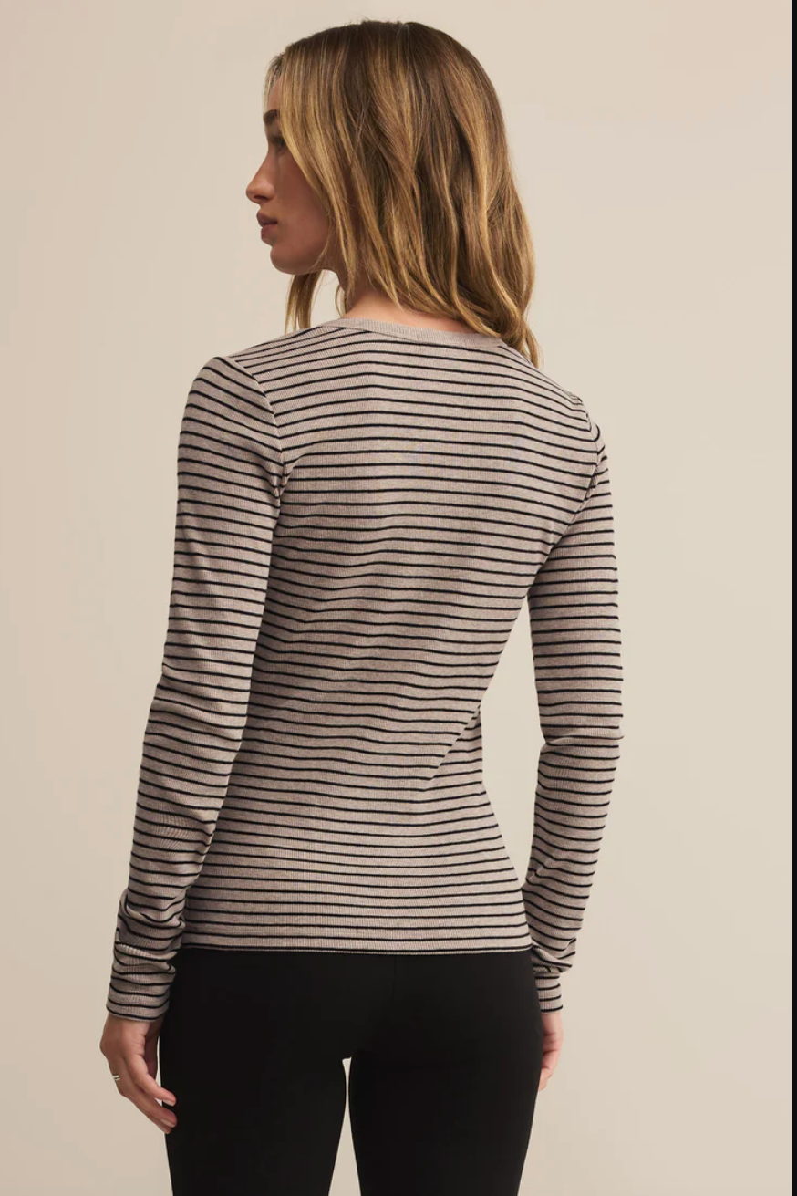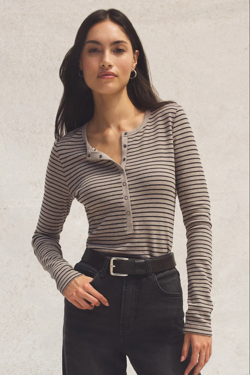 A fresh twist on a favorite silhouette. This striped henley is made from a lightweight cotton modal rib with a close-to-the-body fit, soft stretch, and a snap-front neckline that makes styling effortless.