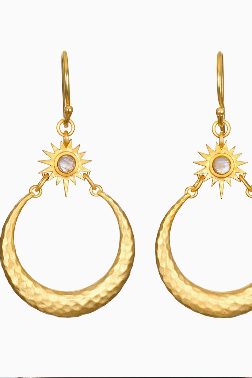 Our sacred sisterhood allows us to shine as brilliantly as the stars; together, our power is limitless. Crescent moons in hammered 18kt gold plate create eye-catching hoop earrings that signify the goddess, nourishment, and protection. Starbursts of moonstone—stone of intuition, passion, and good fortune—inspire dreams and offer guidance.