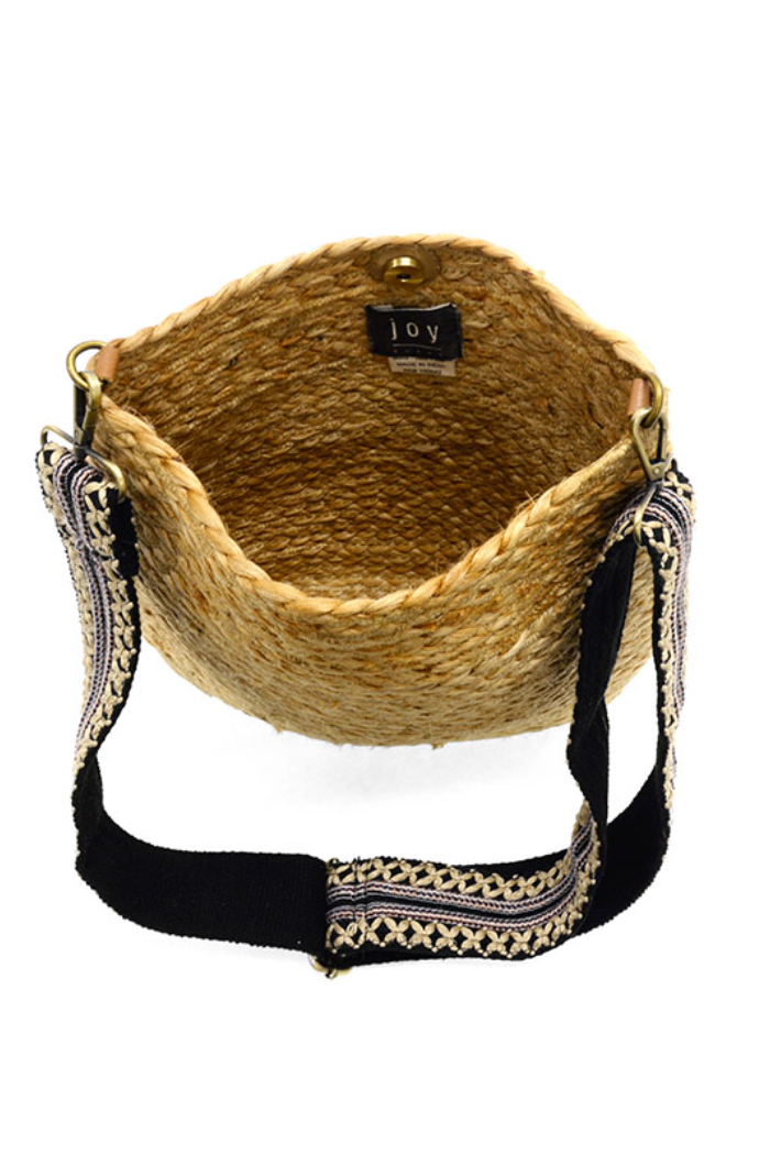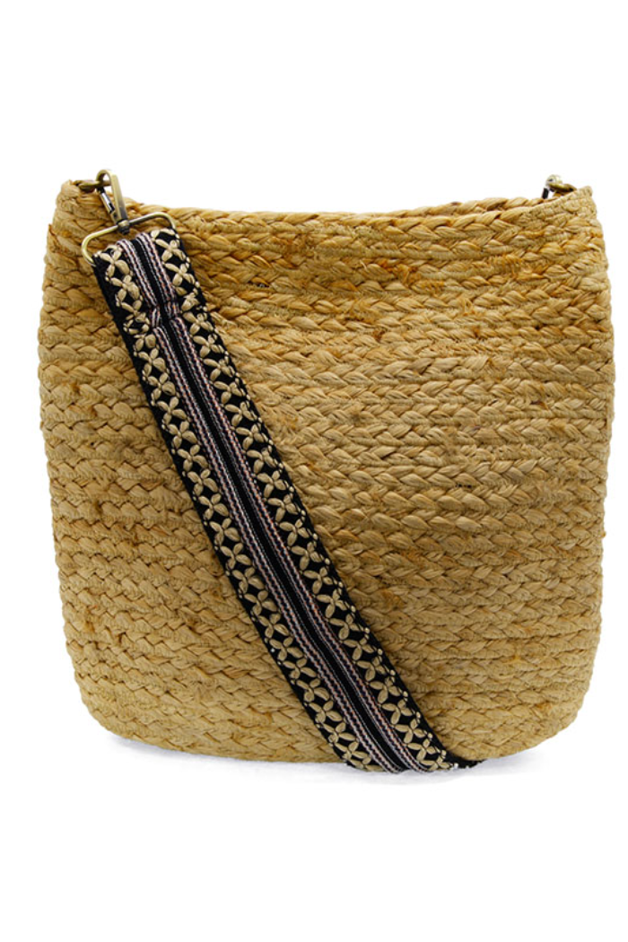 A natural jute bucket combines with our signature embroidered guitar strap for a boho vibe. The guitar strap in black and natural tones will complement any of your looks this summer and will look just as great with jeans or a summer dress.