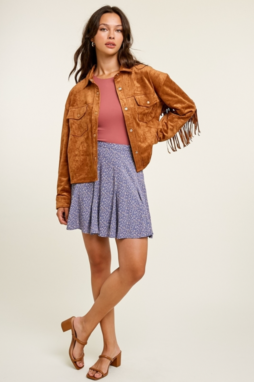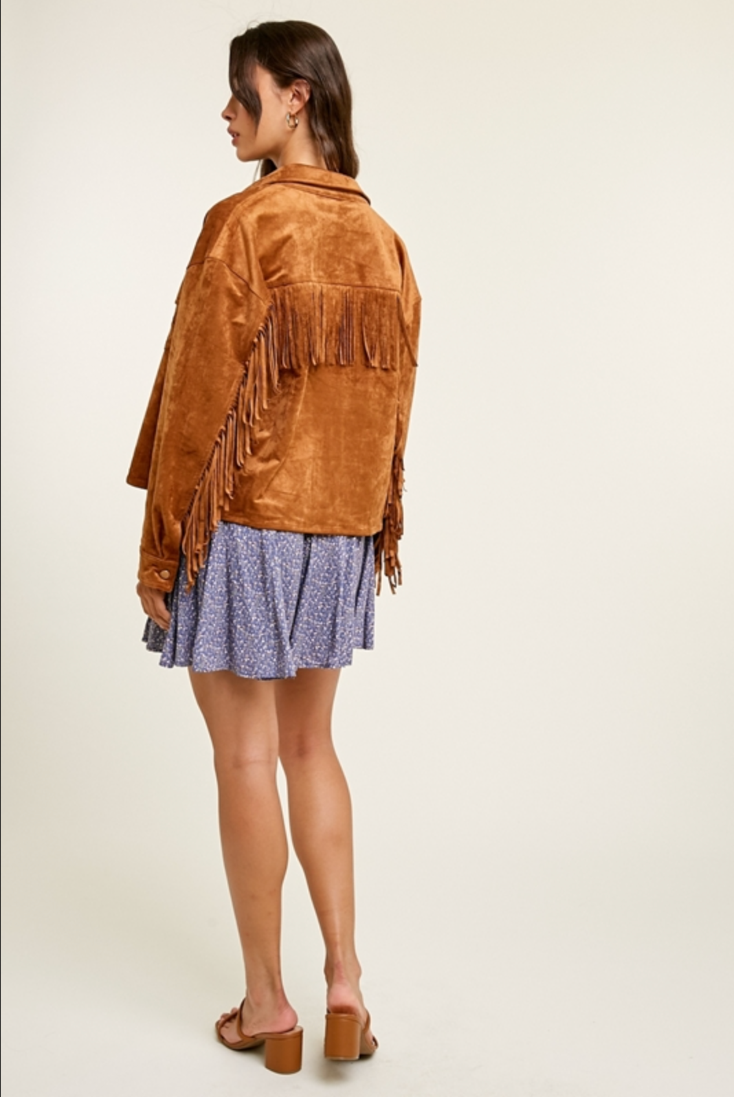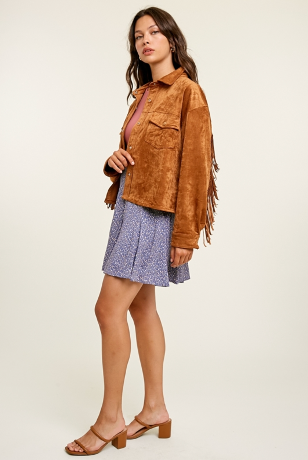 This suede button down jacket is great for a fun night out. The fringe detail makes is perfect for a night out dancing.