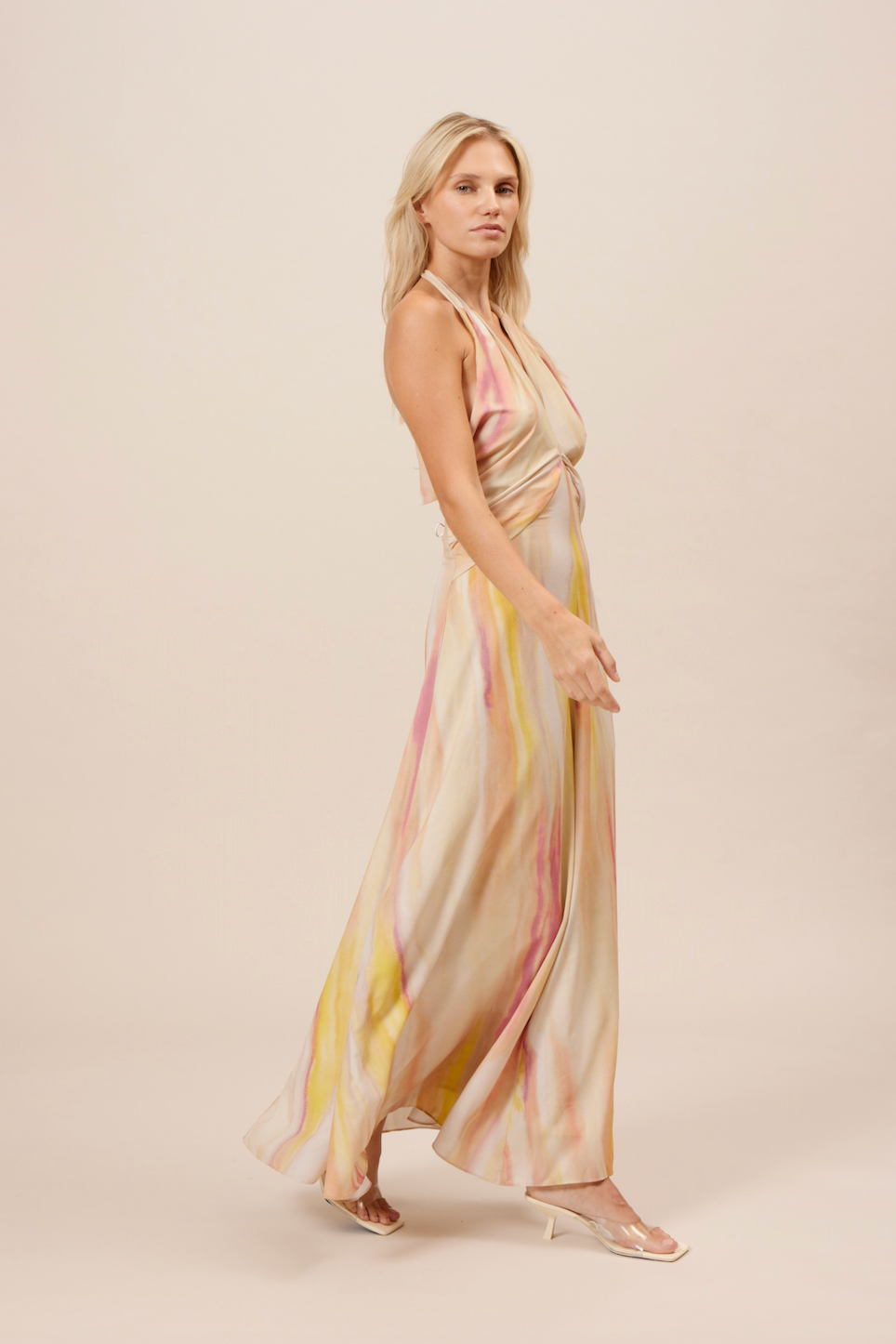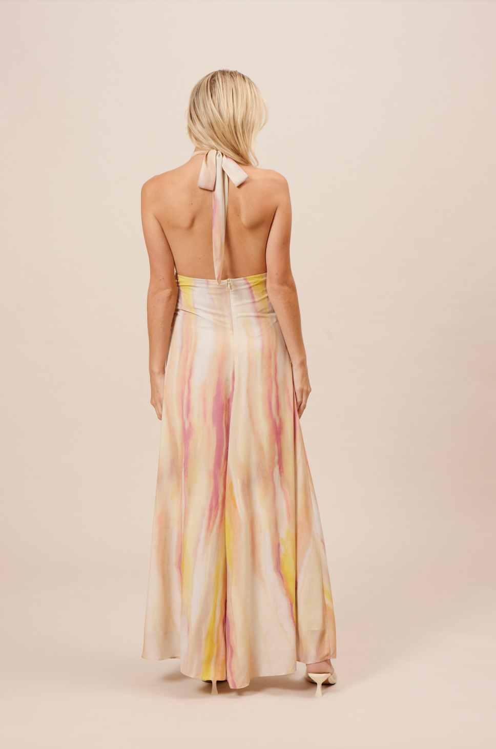Maxi halter dress with a cross front and tie neckline. Print is a soft fall watercolor.