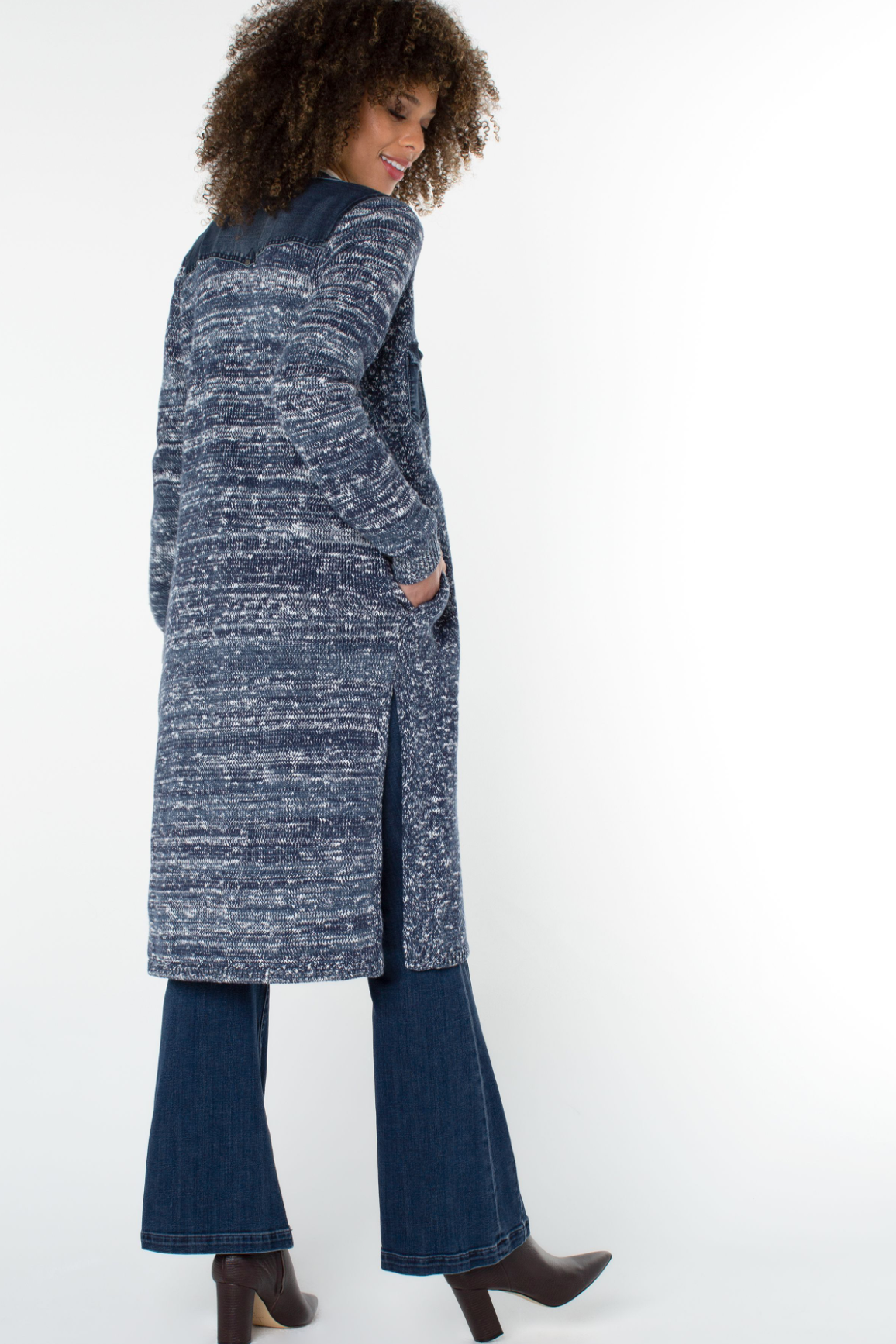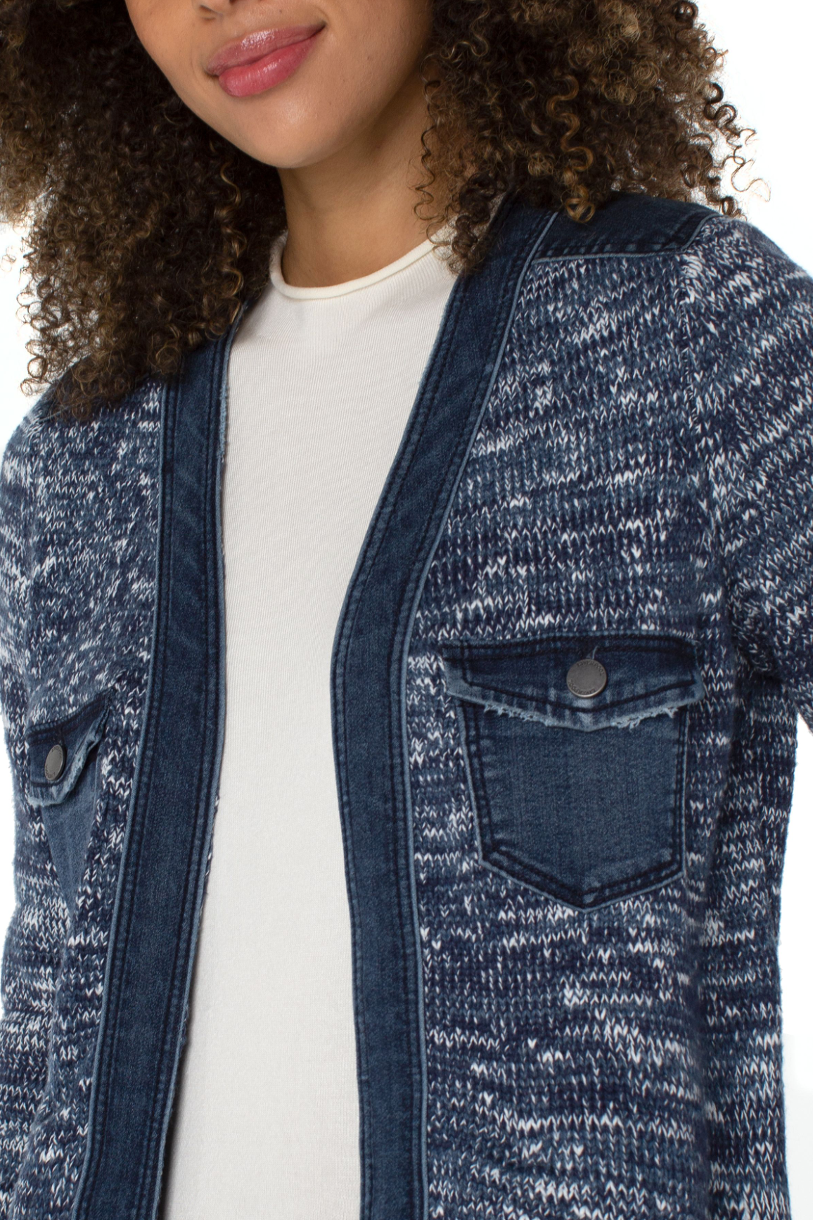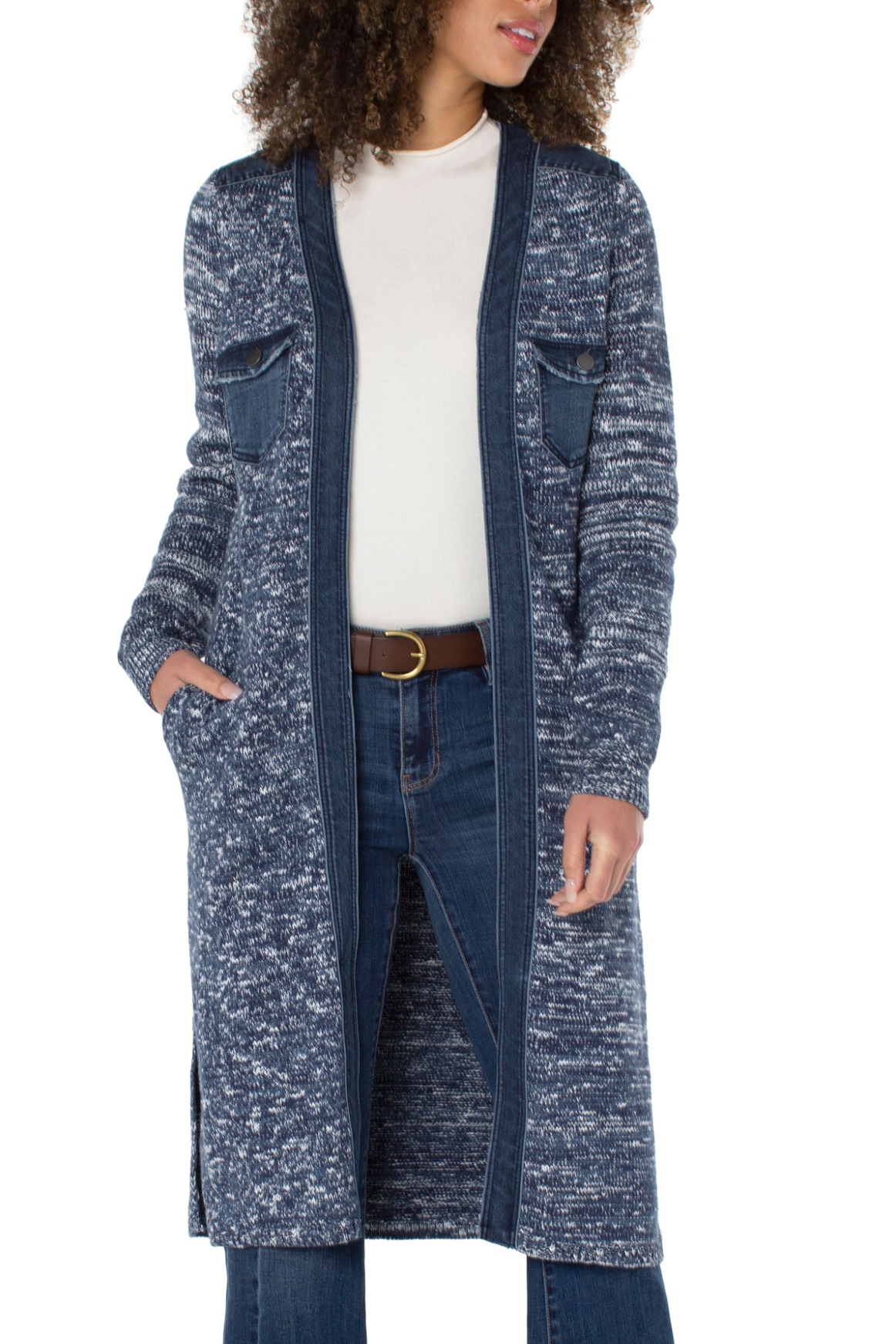 This knit cardigan has a great twist on a basic with the denim detail. Pair it with a basic white top and jeans for a simple but elevated look.