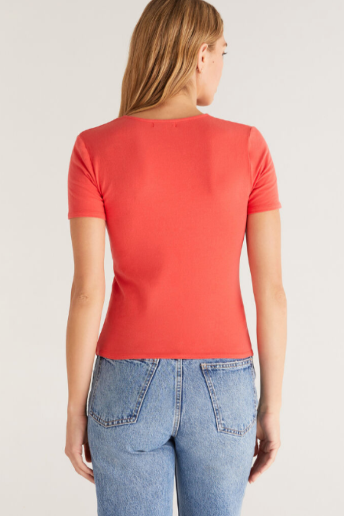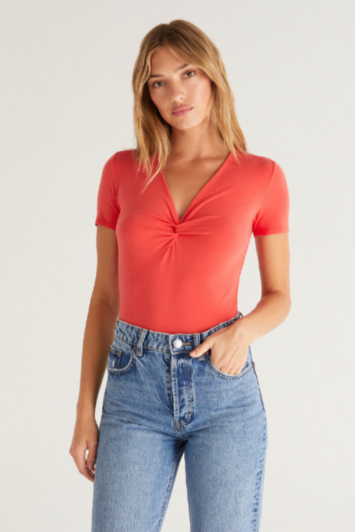The body skimming Tabby Twist Top adds a flirty element to her casual look. With its flattering v-neckline, knot detail and cap sleeves, this Cotton Spandex Jersey can take her from conference call to night out. Worn tucked or untucked, this top will be an instant fave.