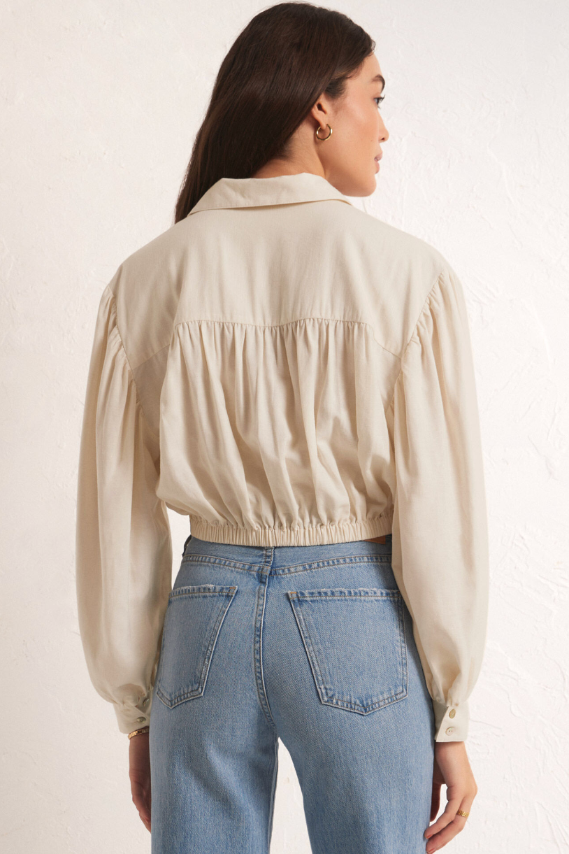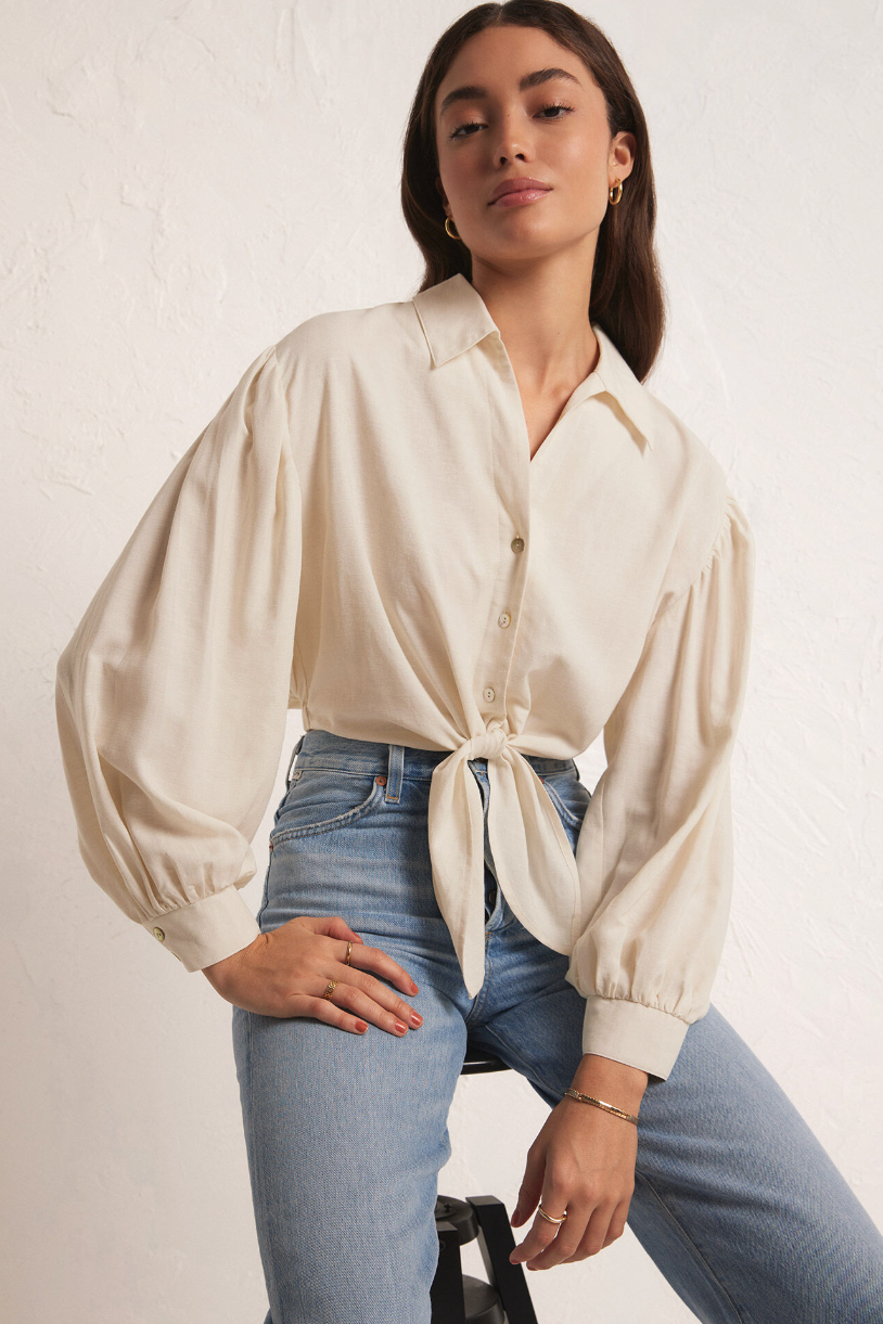 This button down top is a classic style with a collar and tie front. Wear with jeans or dress it up!