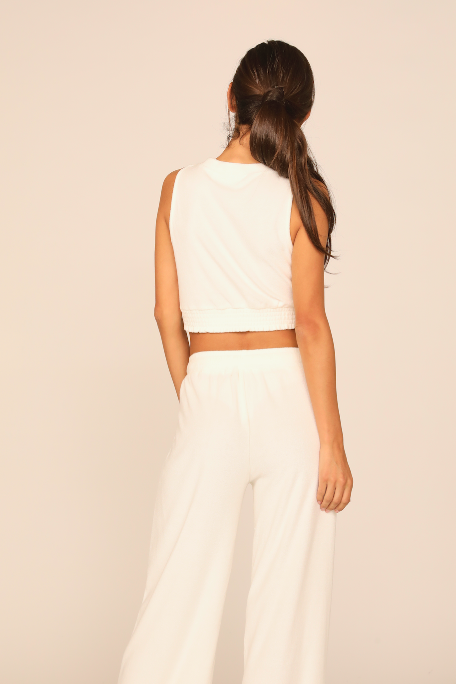 This terry cloth top looks great as a set, worn with the matching hoodie and bottoms. Perfect for THE airport travel day!