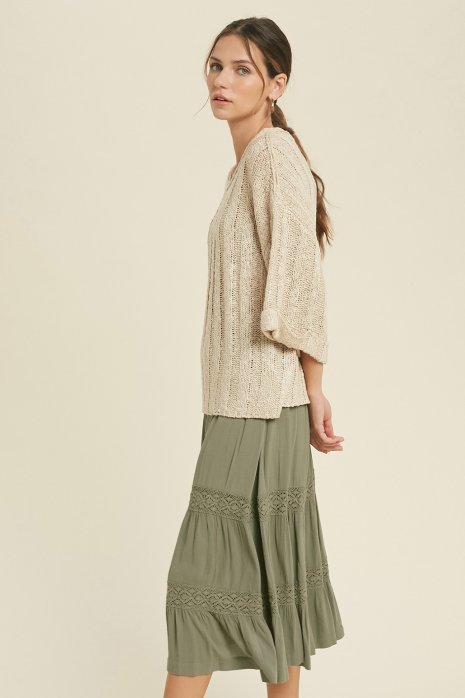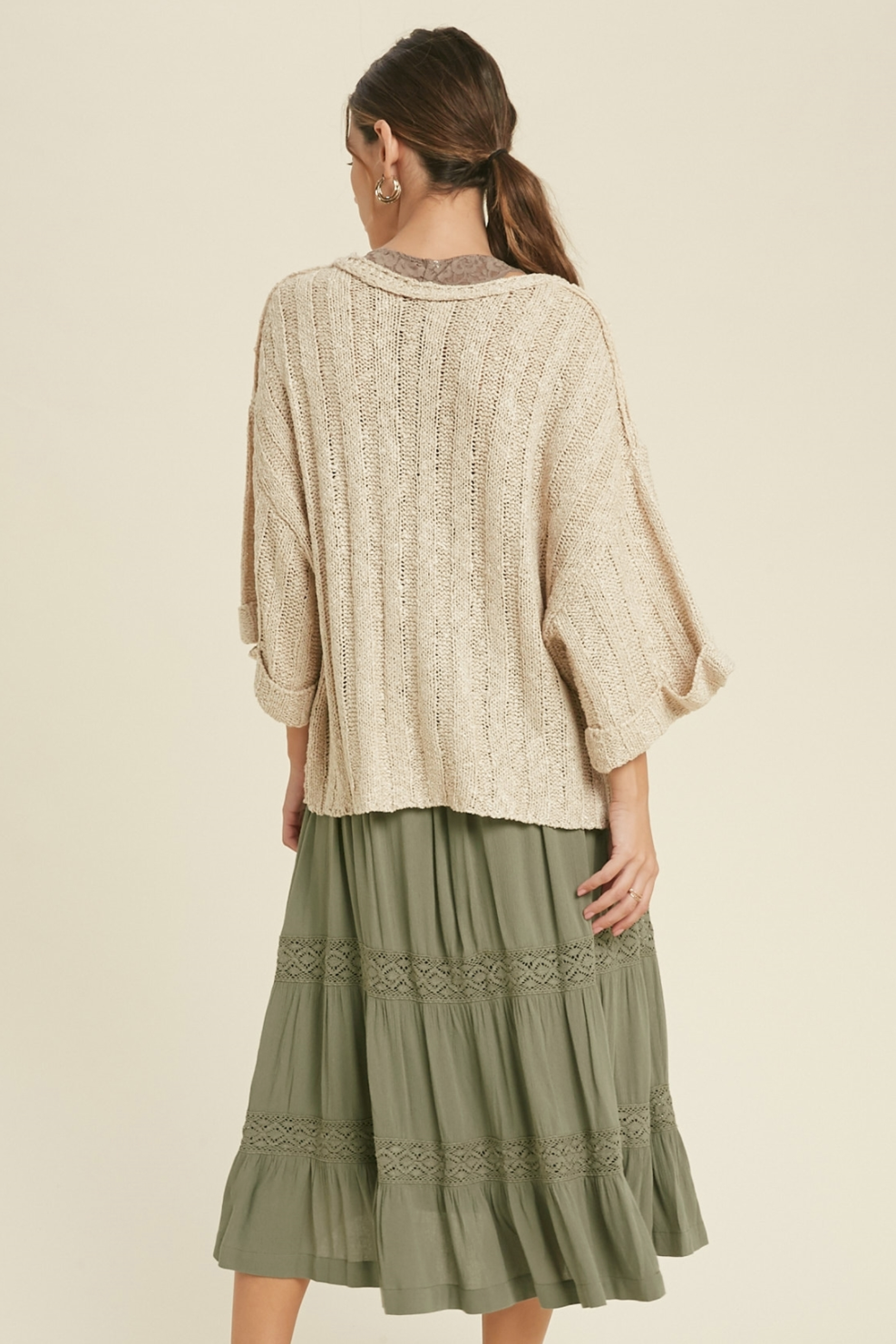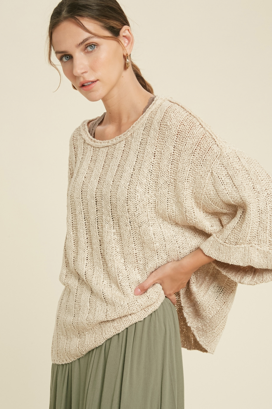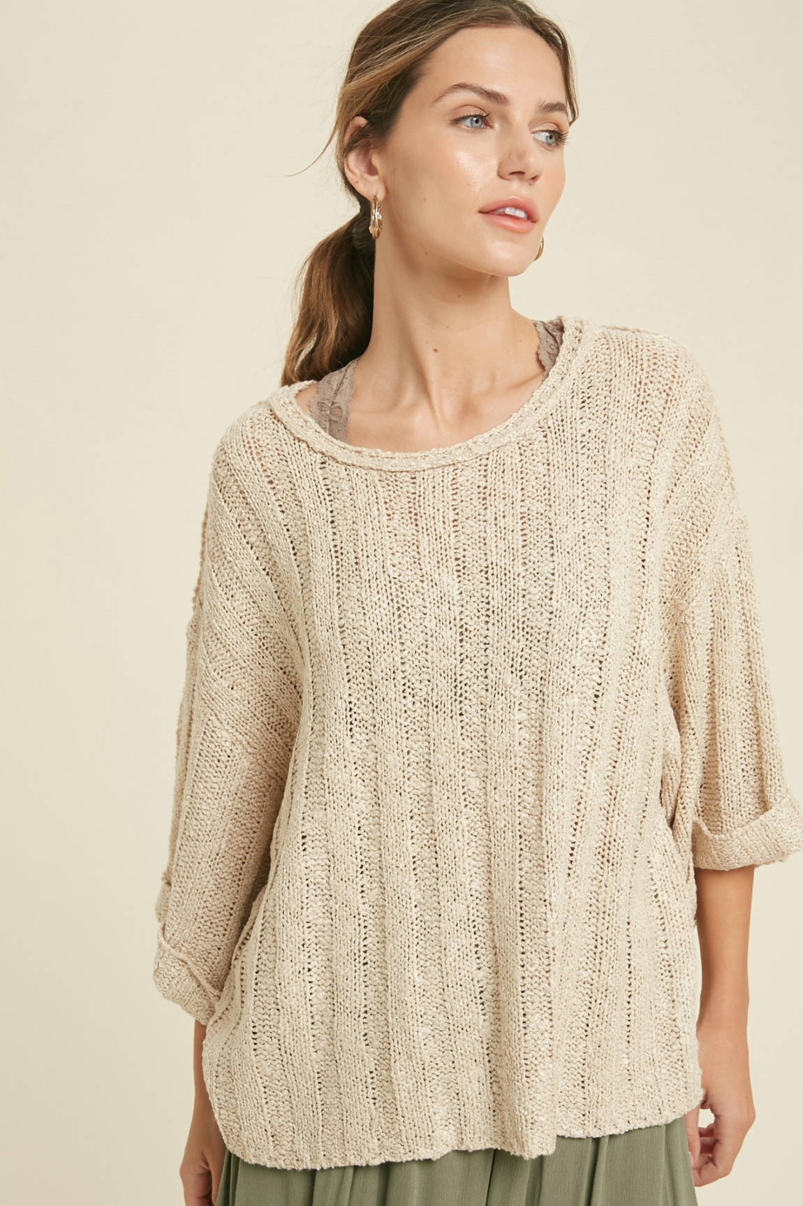 This textured light sweater is great for summer. The taupe color can match with anything and is great to layer with throughout the day.