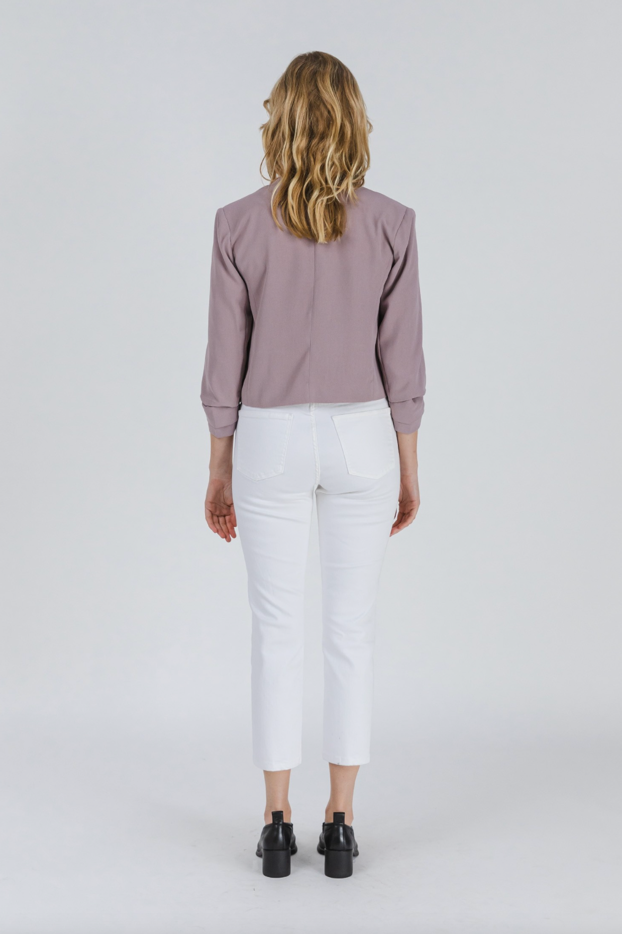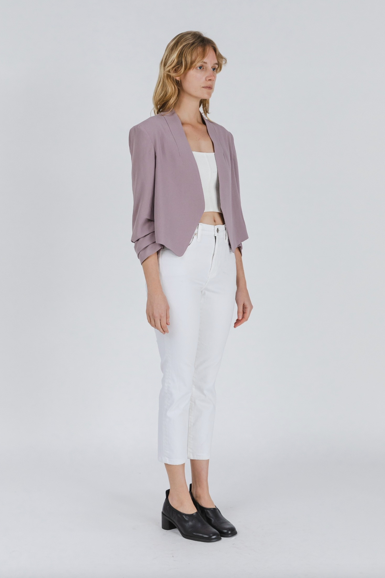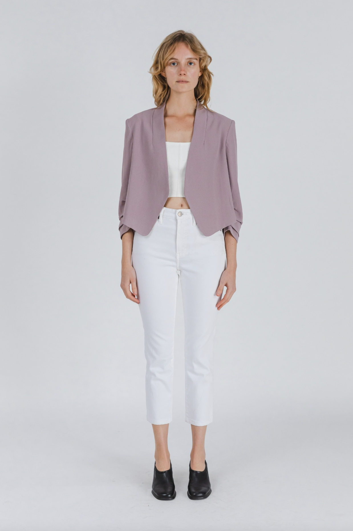 The Celia Blazer is a lightweight, cropped blazer. The body features a relaxed draped and a ruched hem sleeve.