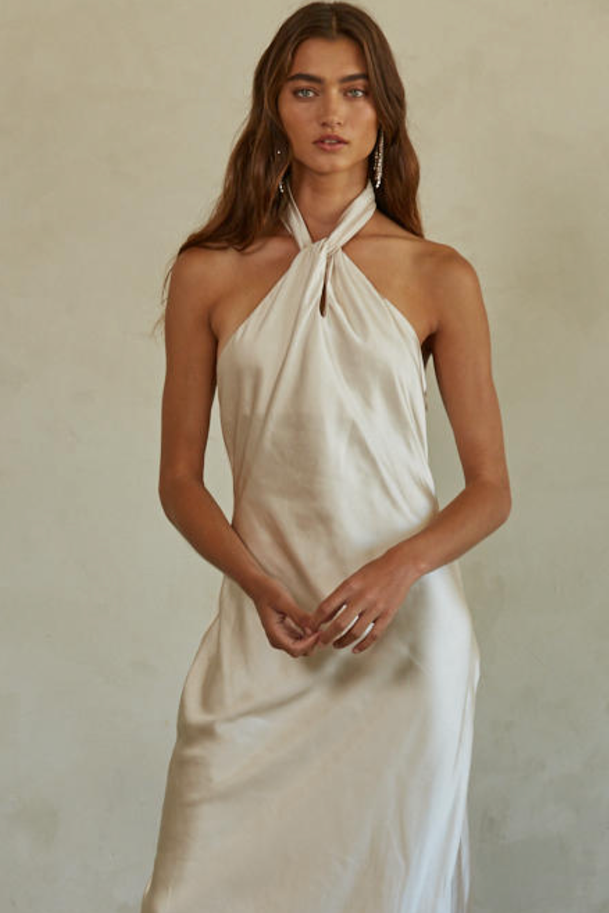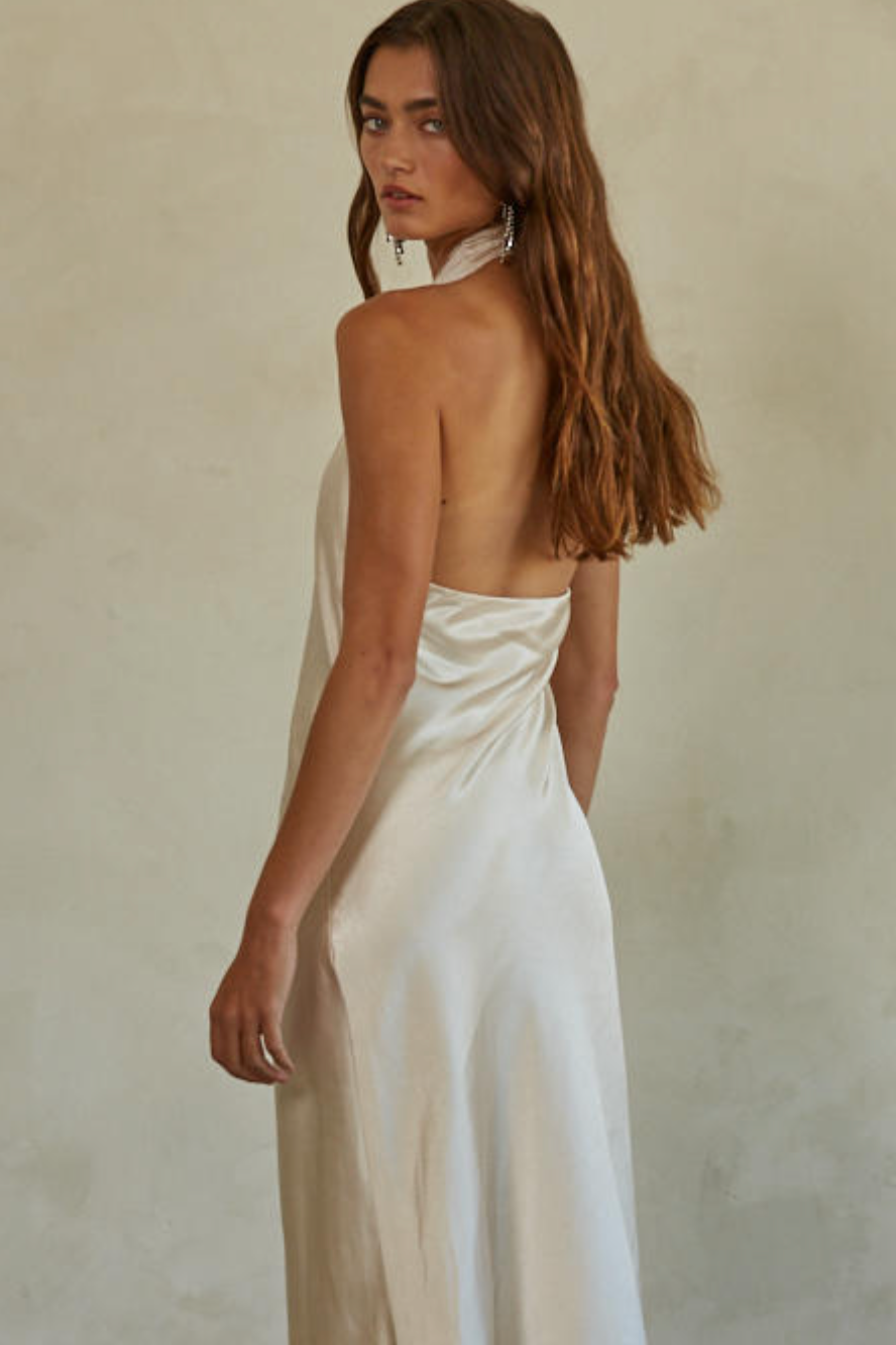 Feel elegant in The Iris Dress. This halter neck maxi dress will look flattering for a formal event, and you will be sure to receive compliments!