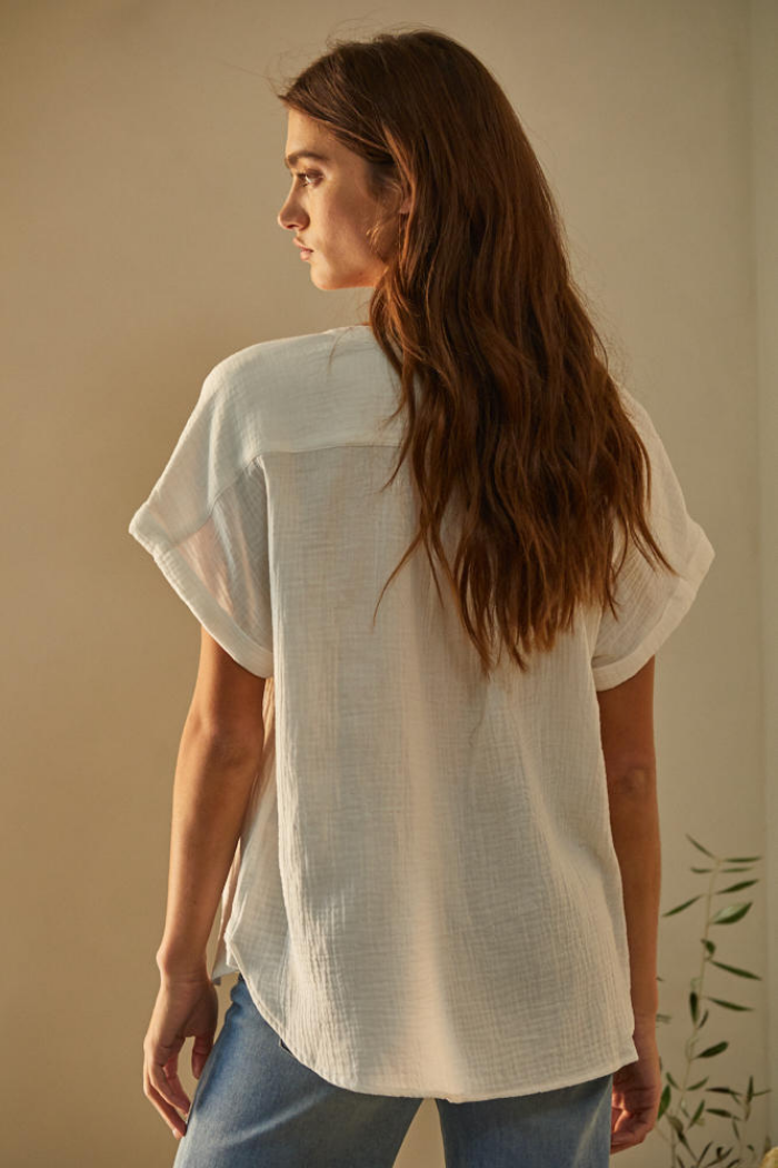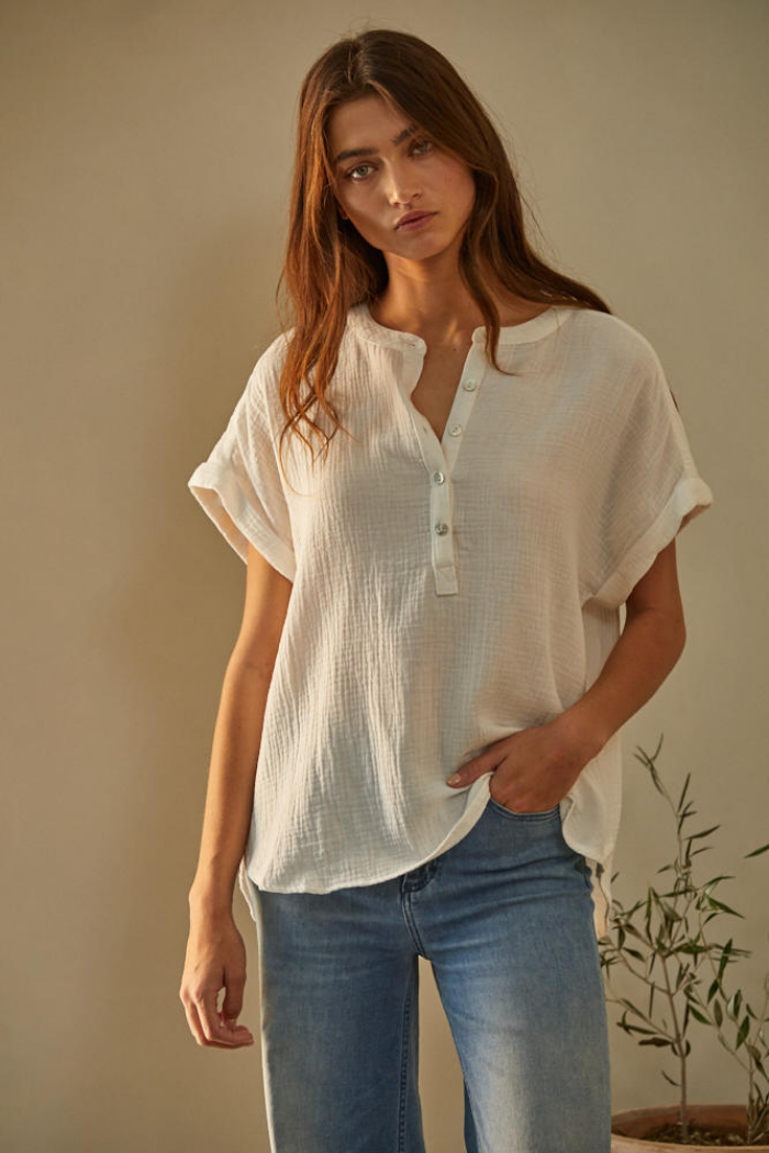 Woven Cotton Gauze Button Down Round Neck Short Sleeve Top