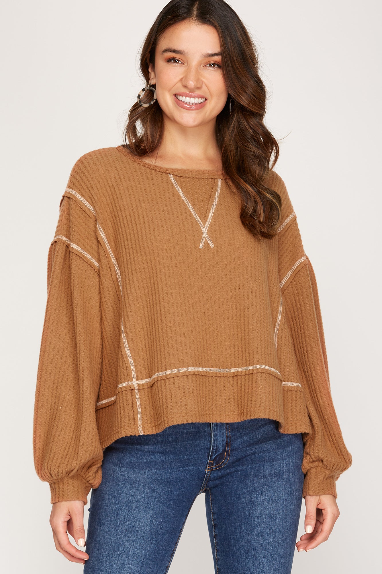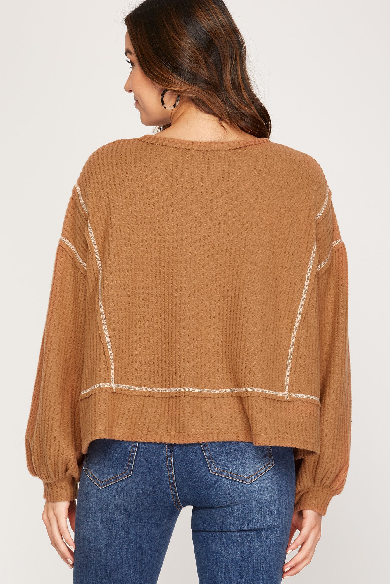 Super soft, this brushed thermal knit top pairs well with jeans or leggings. Model wearing size small.