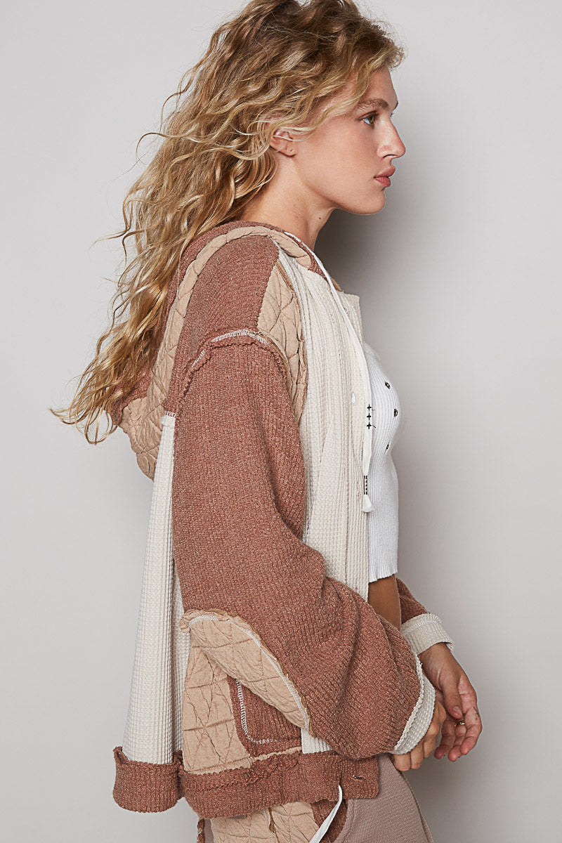 Designed in button down oversized fit jacket with hoodie featured in thermal, quilted knit and cut and sew sweater knit.