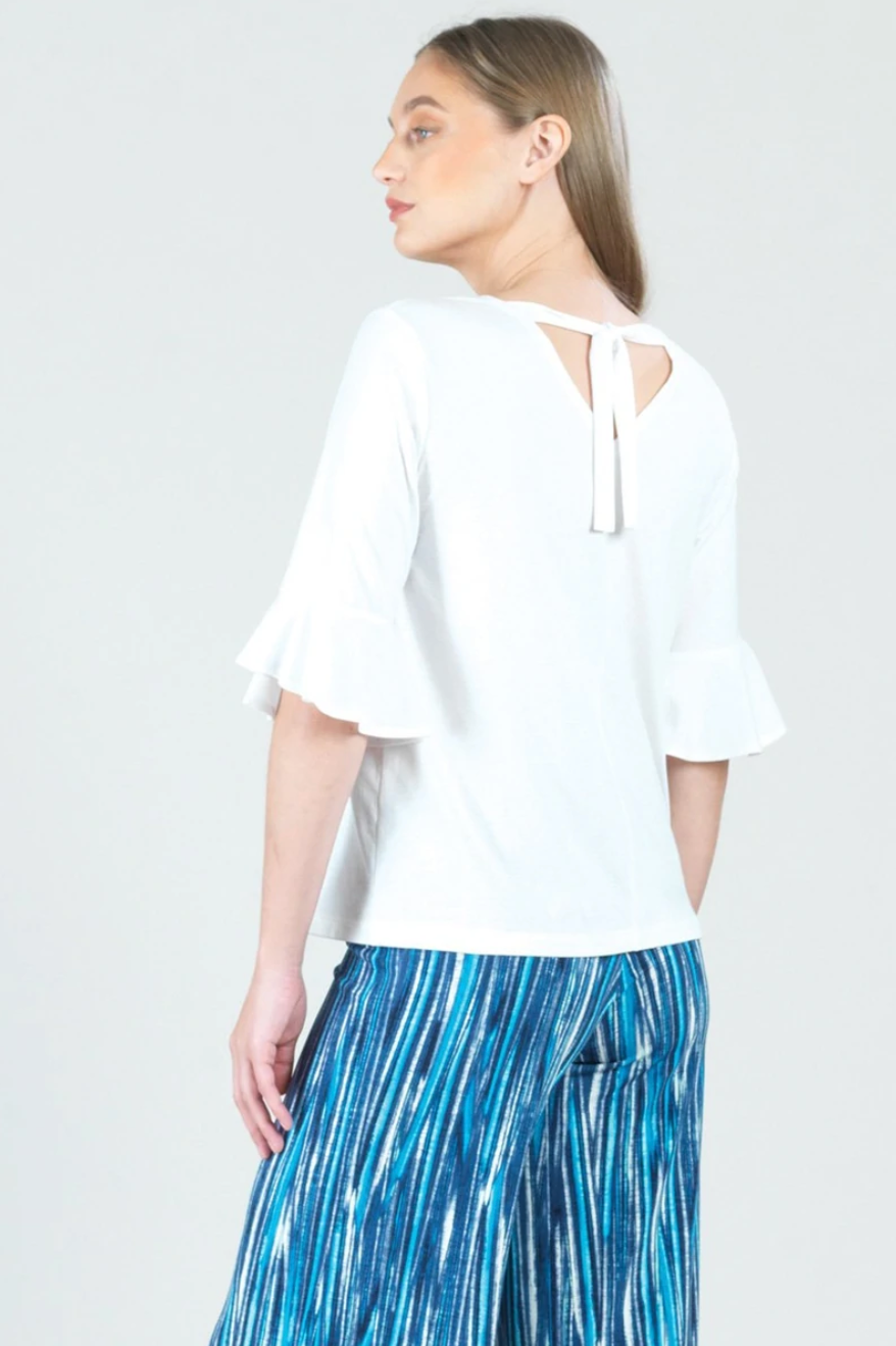 Featuring a high round neckline, vented elbow-length tulip cuffed sleeves, charming tie-back detail, and straight waist hemline.