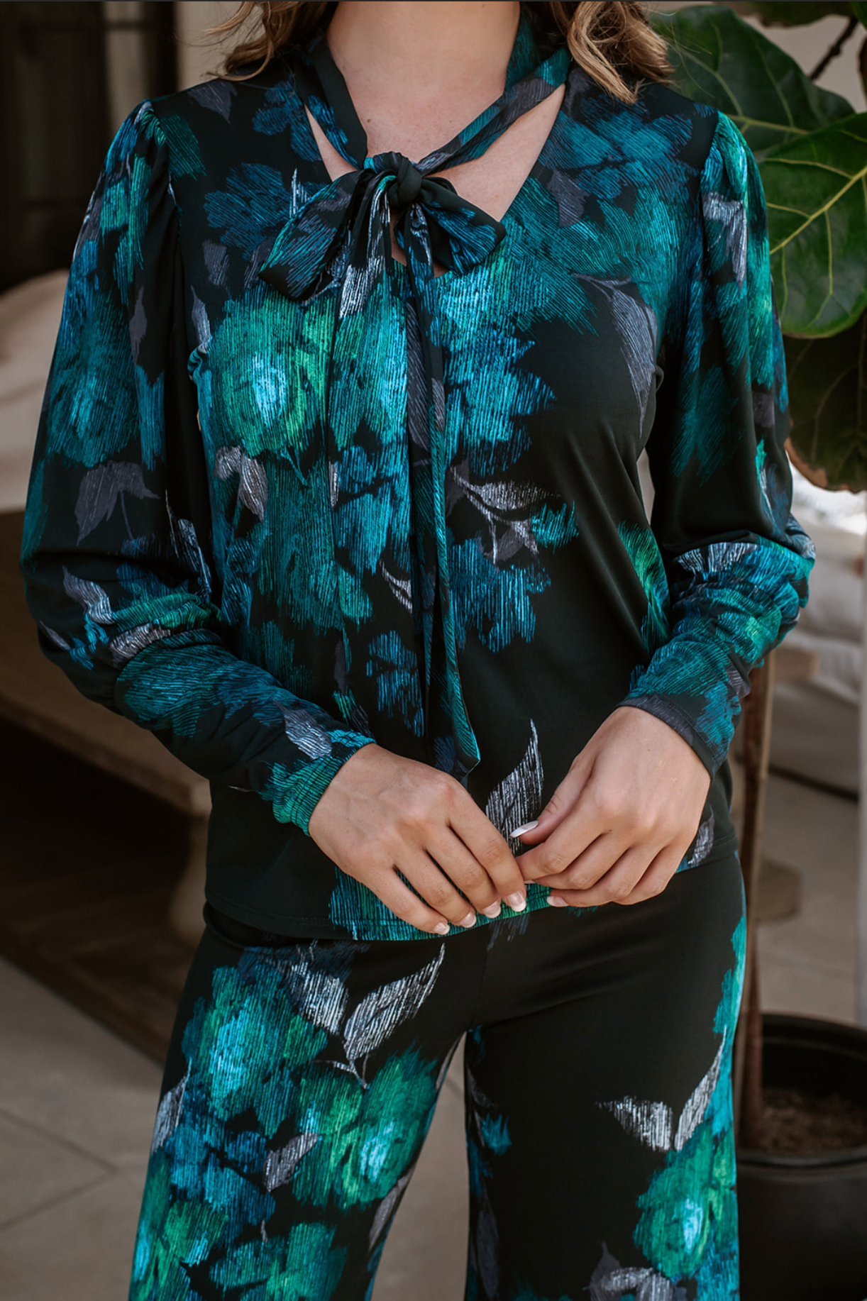 This beautiful tie top is great for fall/winter night out with friends or a dinner date. The shades of blue detailing looks great with jeans.