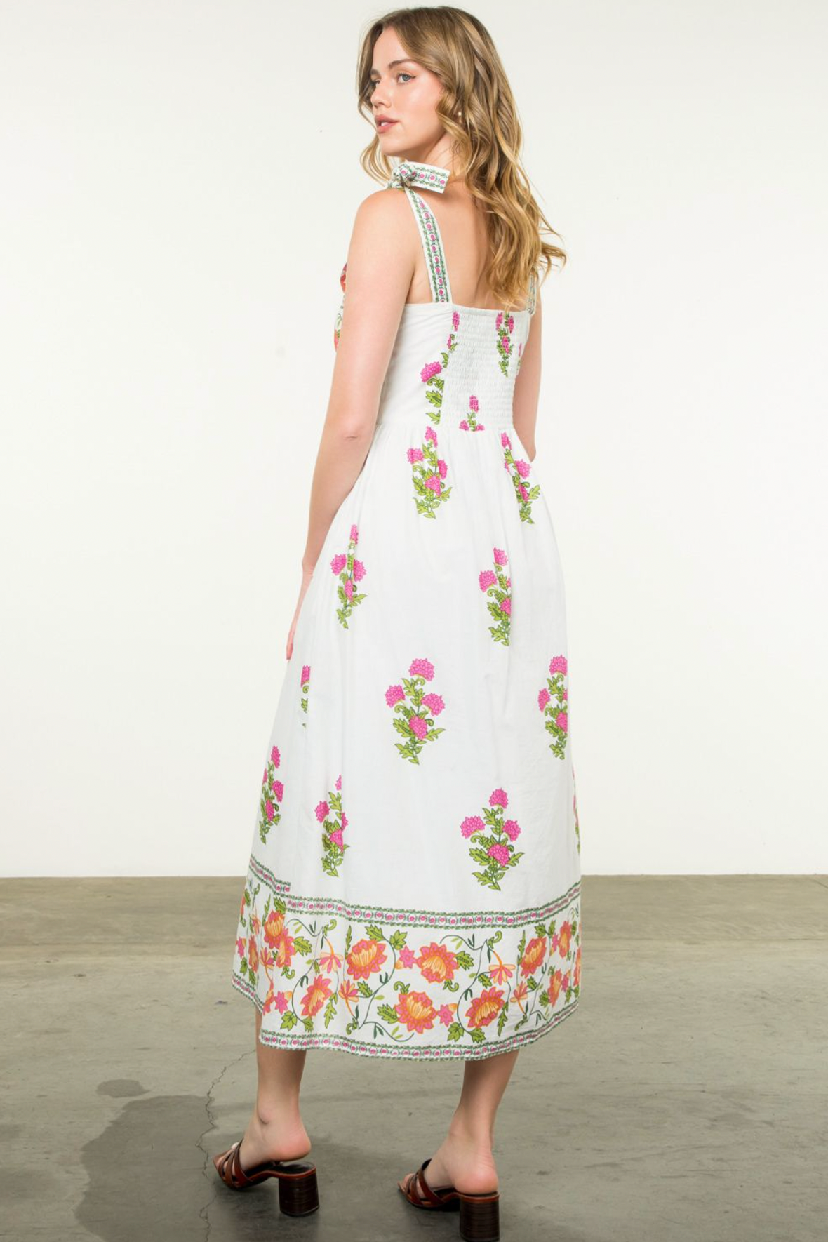 This Tie Strap Floral Midi Dress has colorful embroidery that adds a pop of color. With a flowing skirt and front button down closure, this dress has a flattering style. Wear on your next vacation!