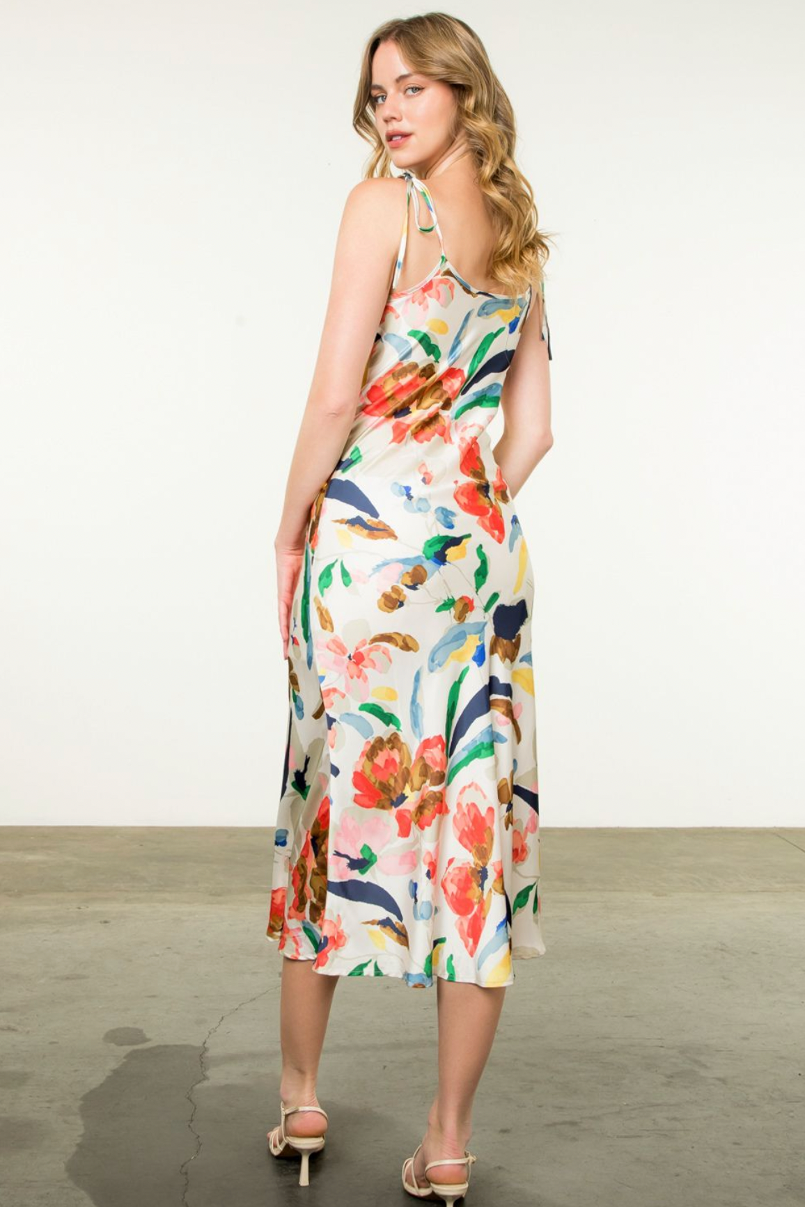 The vibrant Tie Strap Print Dress is elegant and lively look. Featuring a mix of colors, this dress also has a flattering drape for a timeless style. Complementary to an airy, summer vibe.