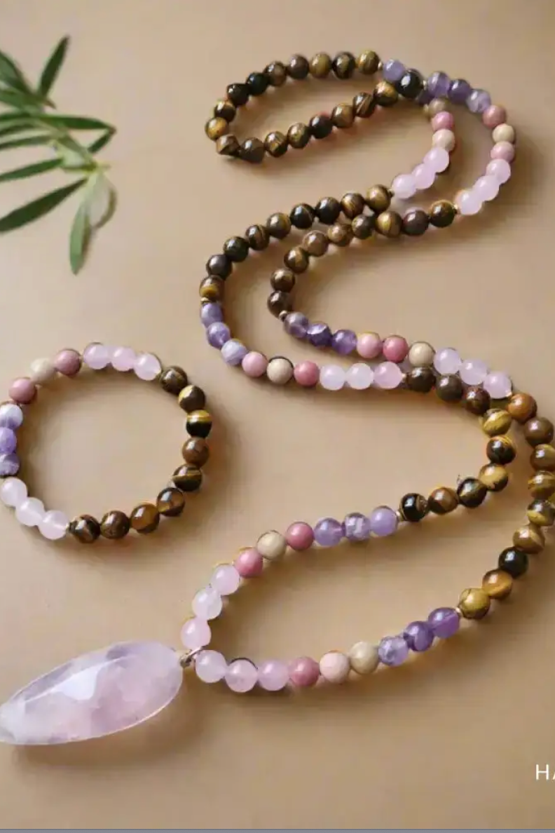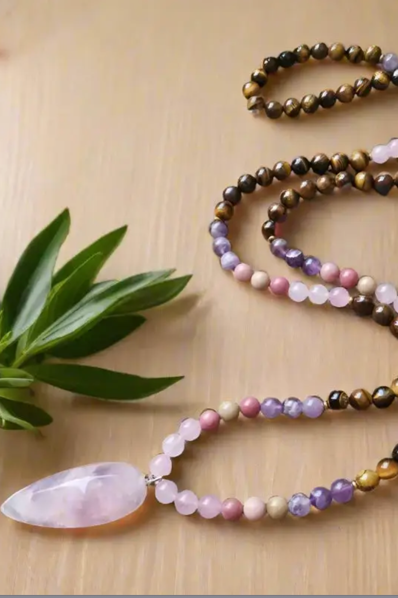 Handcrafted with 108 beads of natural Tiger Eye, Amethyst, Rose Quartz, and Rhodonite, this mala necklace promotes strength and emotional healing. Featuring a Rose Quartz pendant, it enhances love and compassion. Tiger Eye offers courage and protection, Amethyst provides calming energy, Rose Quartz fosters emotional healing, and Rhodonite supports balance. Perfect for daily wear or meditation, this necklace measures around 91cm.