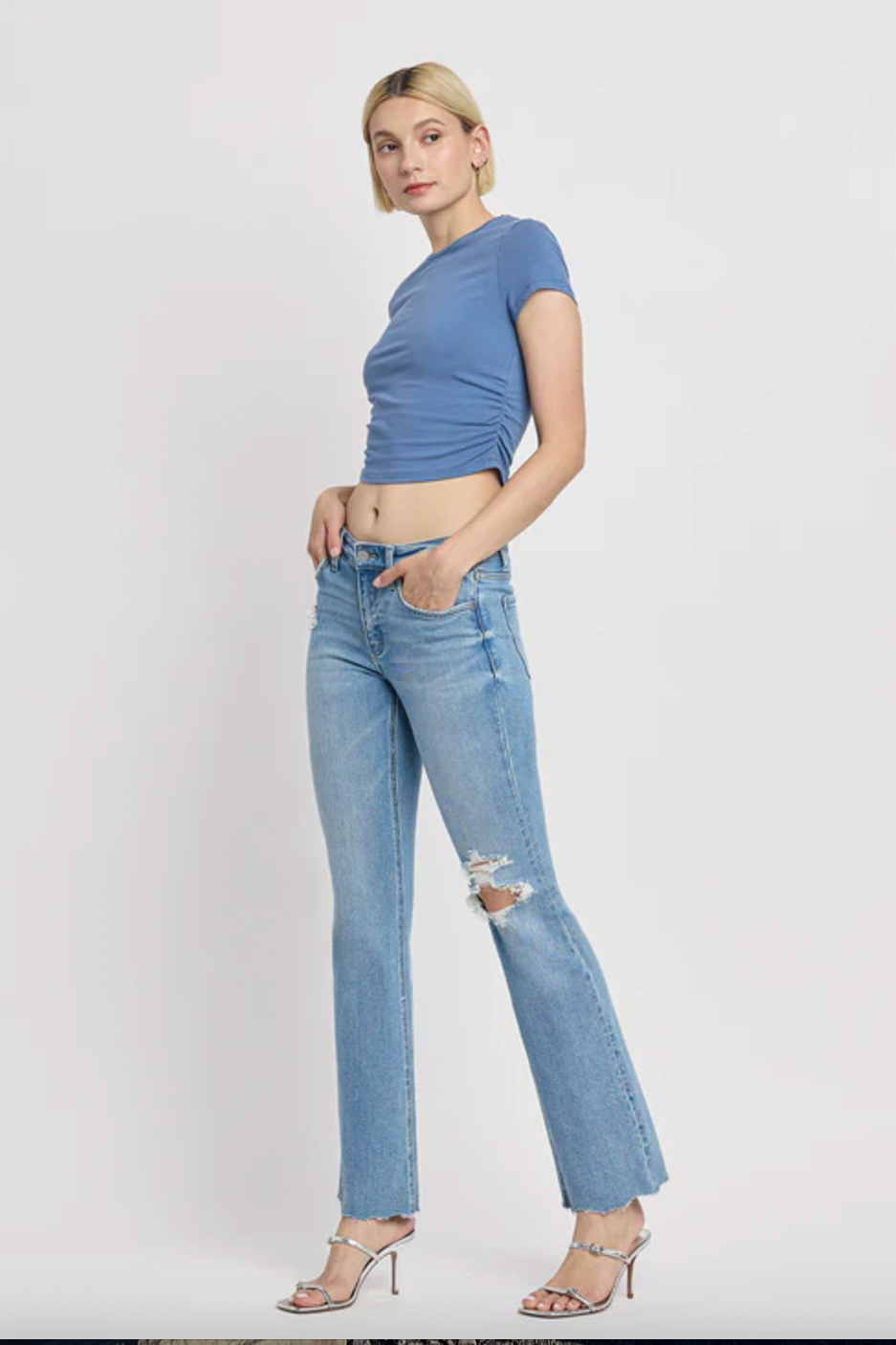 Comfort stretch denim, mid rise waist, distressed detail, raw hem, full length, bootcut jeans