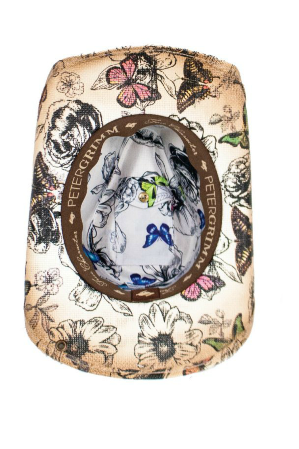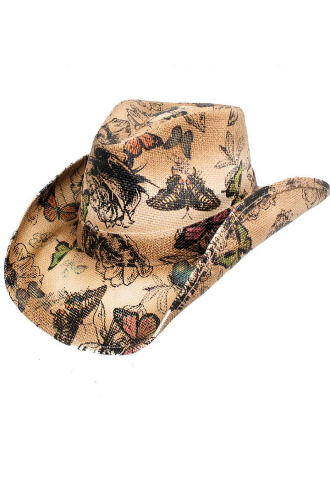 This is a classic western style drifter hat with a unique butterfly screen printed design.