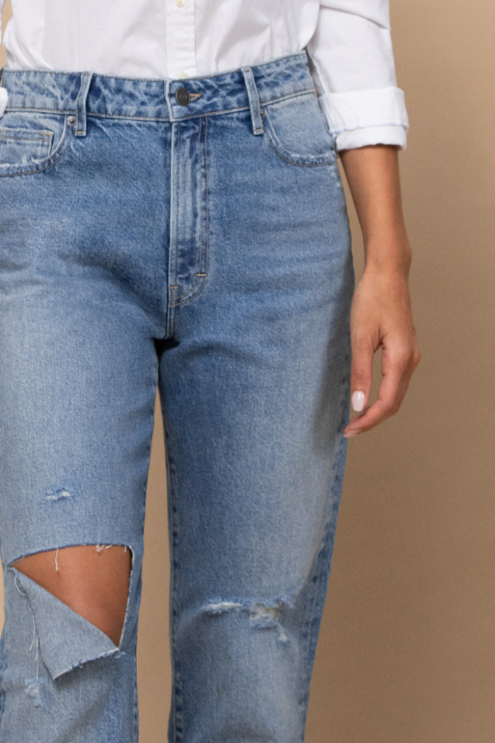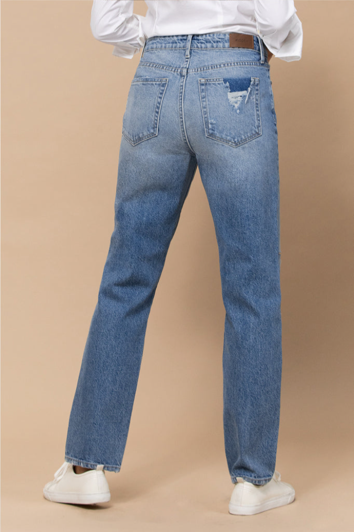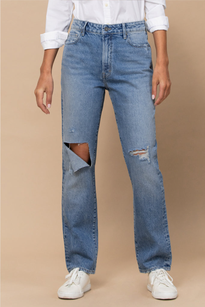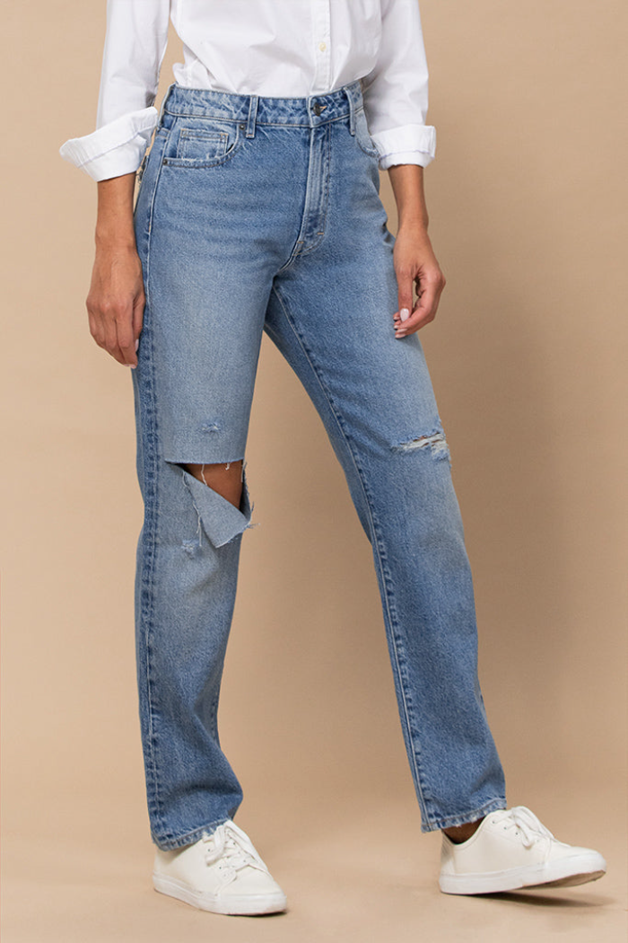 A medium wash knee cut straight fit. Day or night these classic fun jeans will go with you.