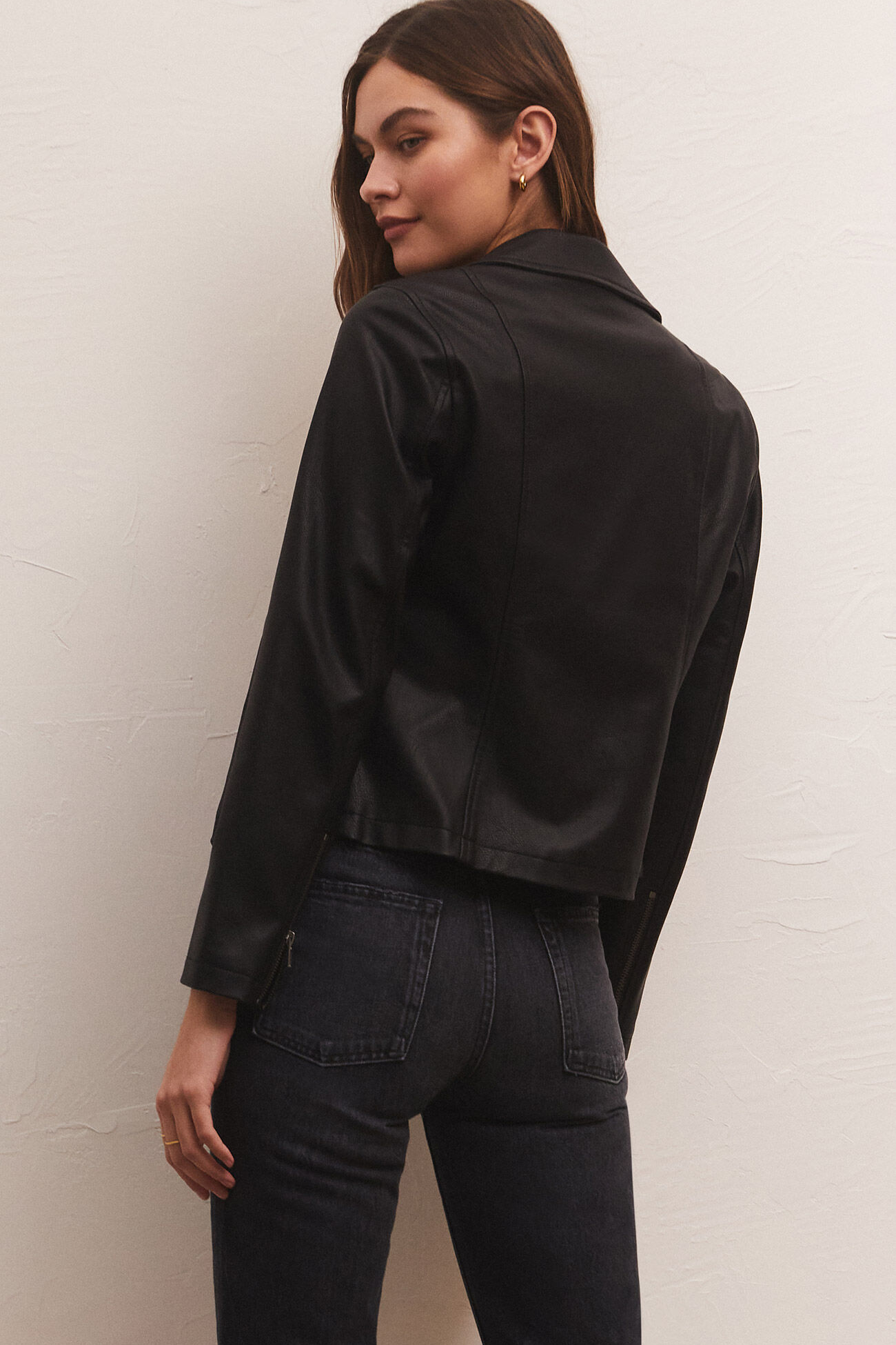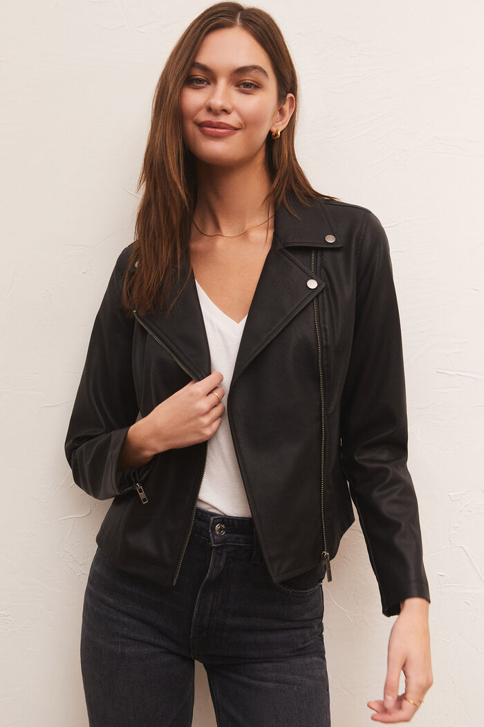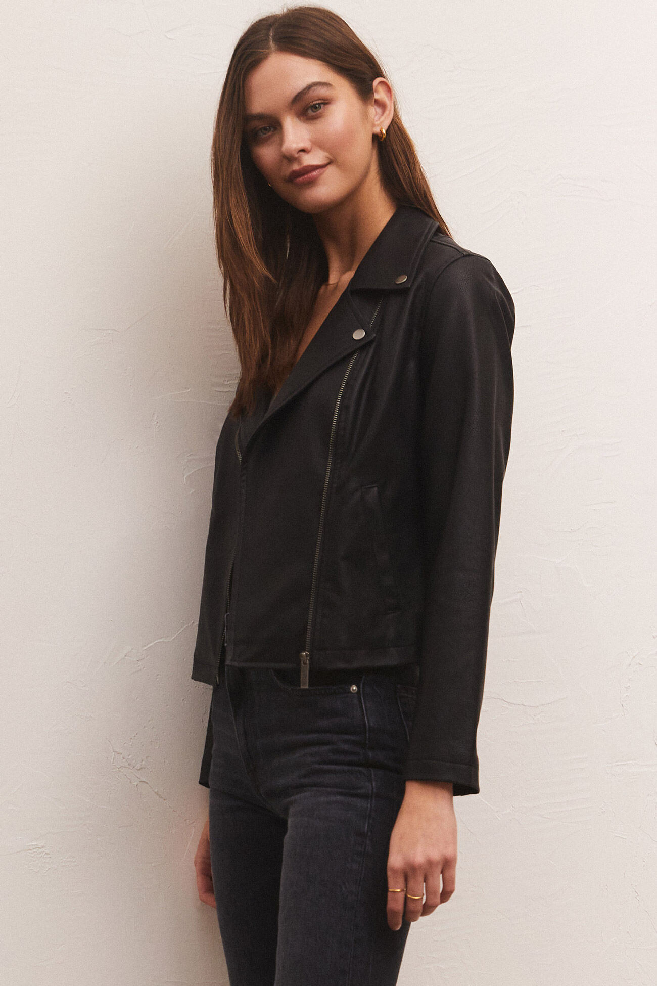 Add an instant edginess to any look with this faux leather statement jacket. The fully lined Trina Moto Jacket is made using our vegan faux leather fabric and features an asymmetrical zip front, zippered sleeves, and functional welt pockets for a cool look you'll wanna wear all season.
