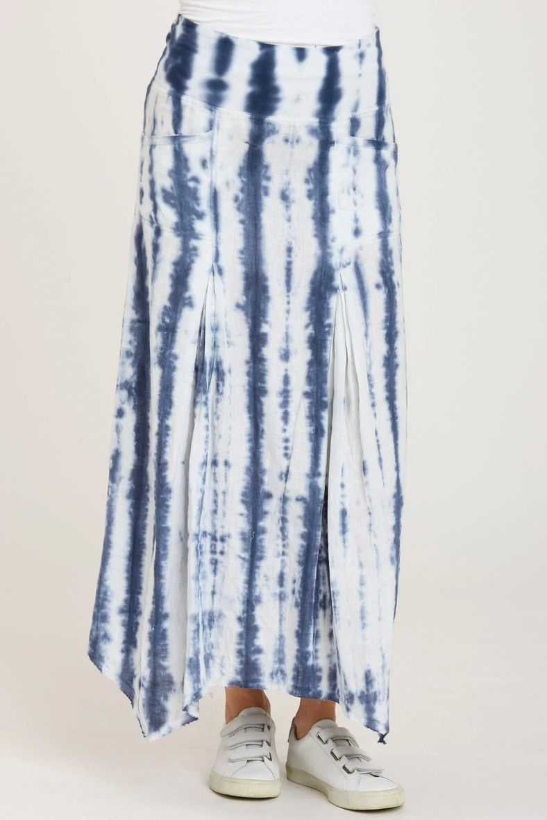 The Triste Skirt has a maxi length, with a raw edge sharkbite hem that adds shape to the silhouette. This skirt features front and back pockets.