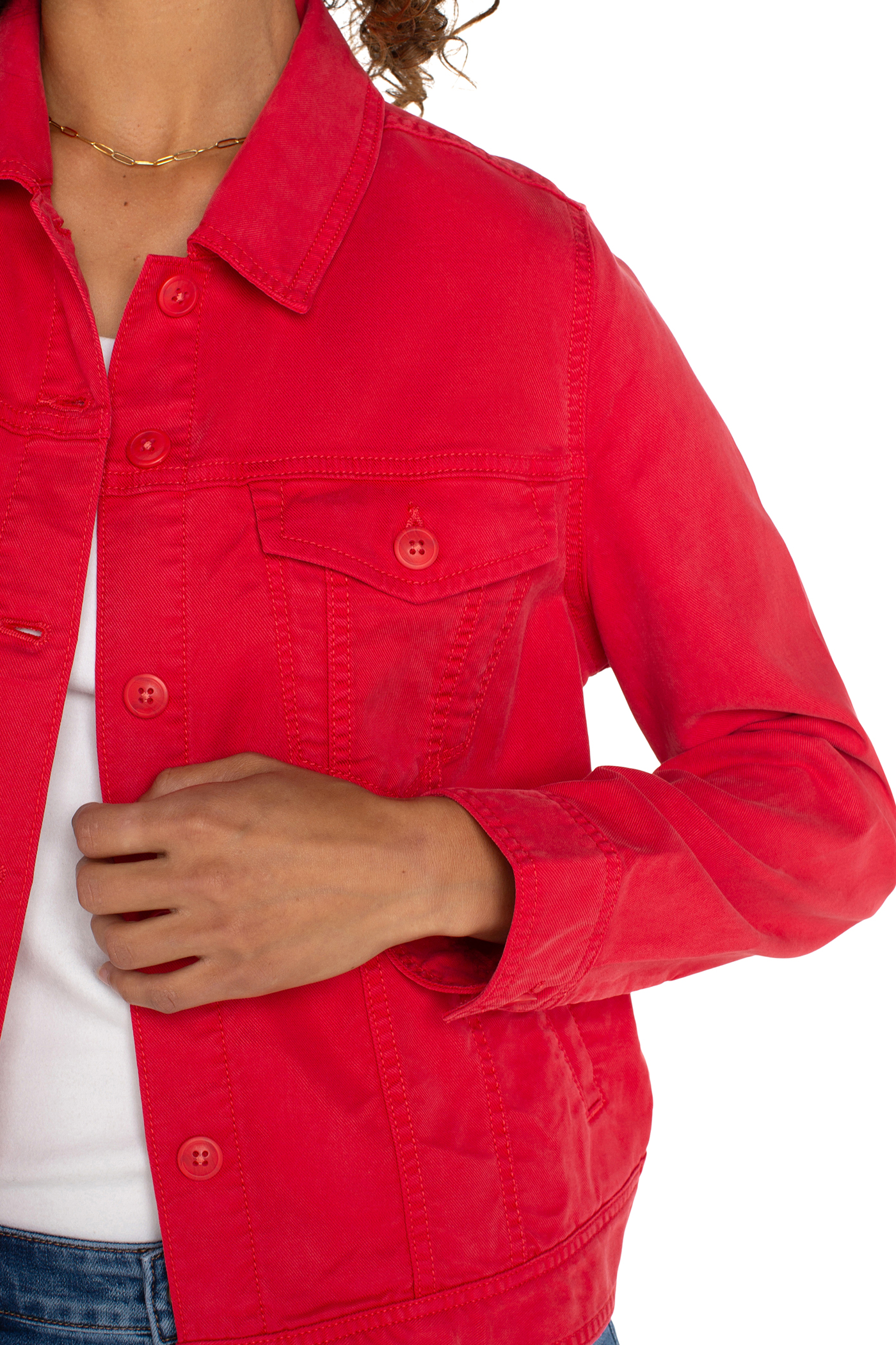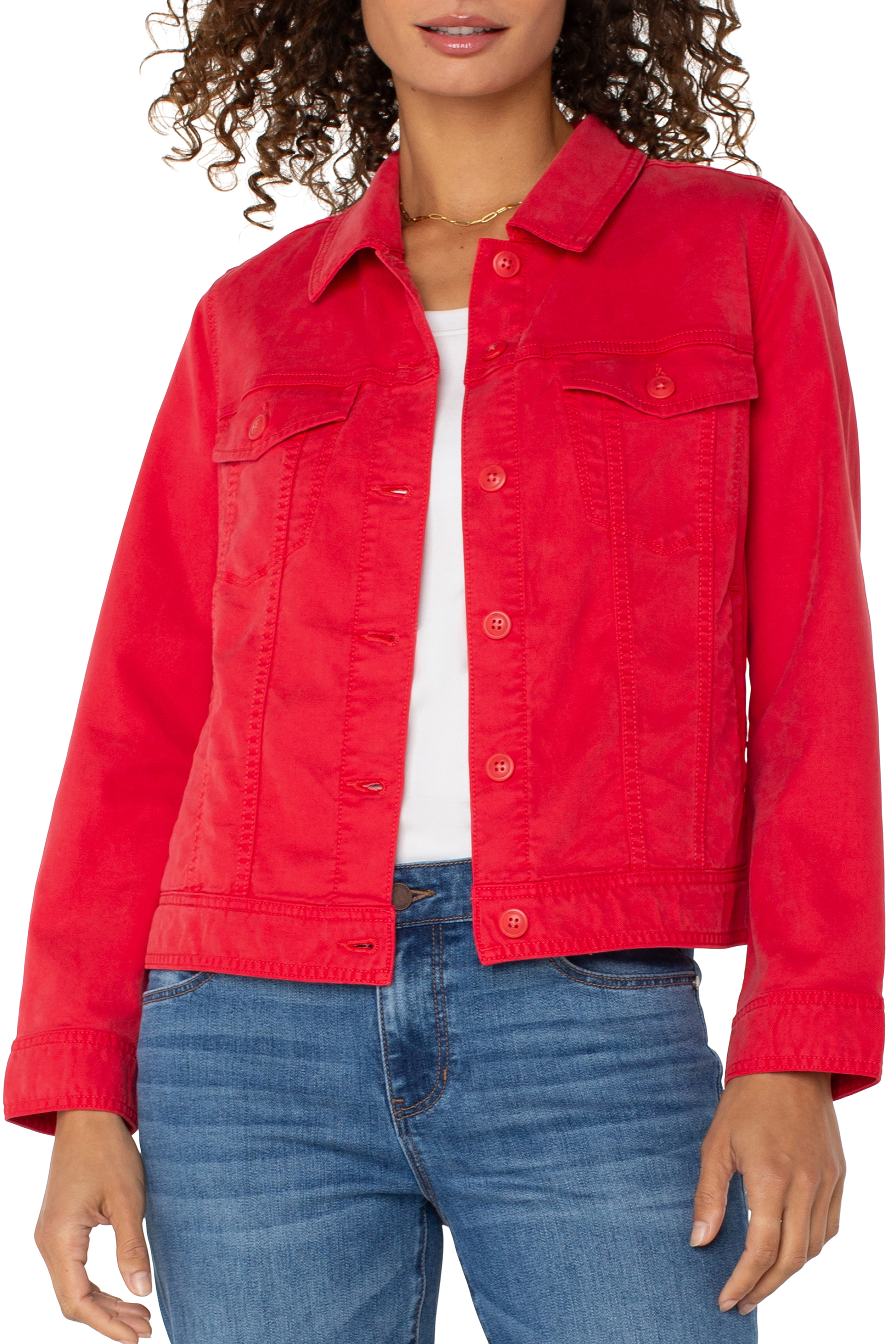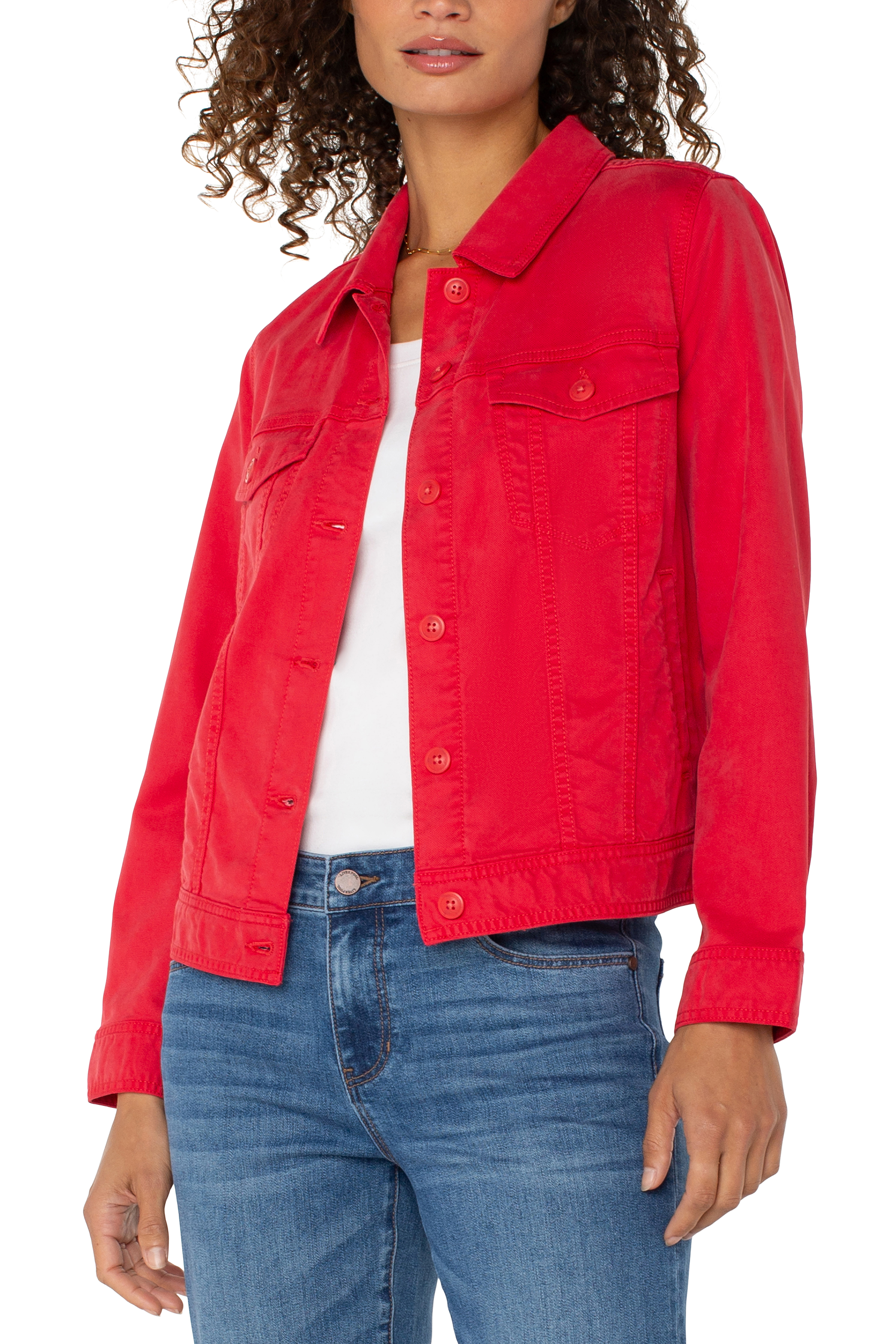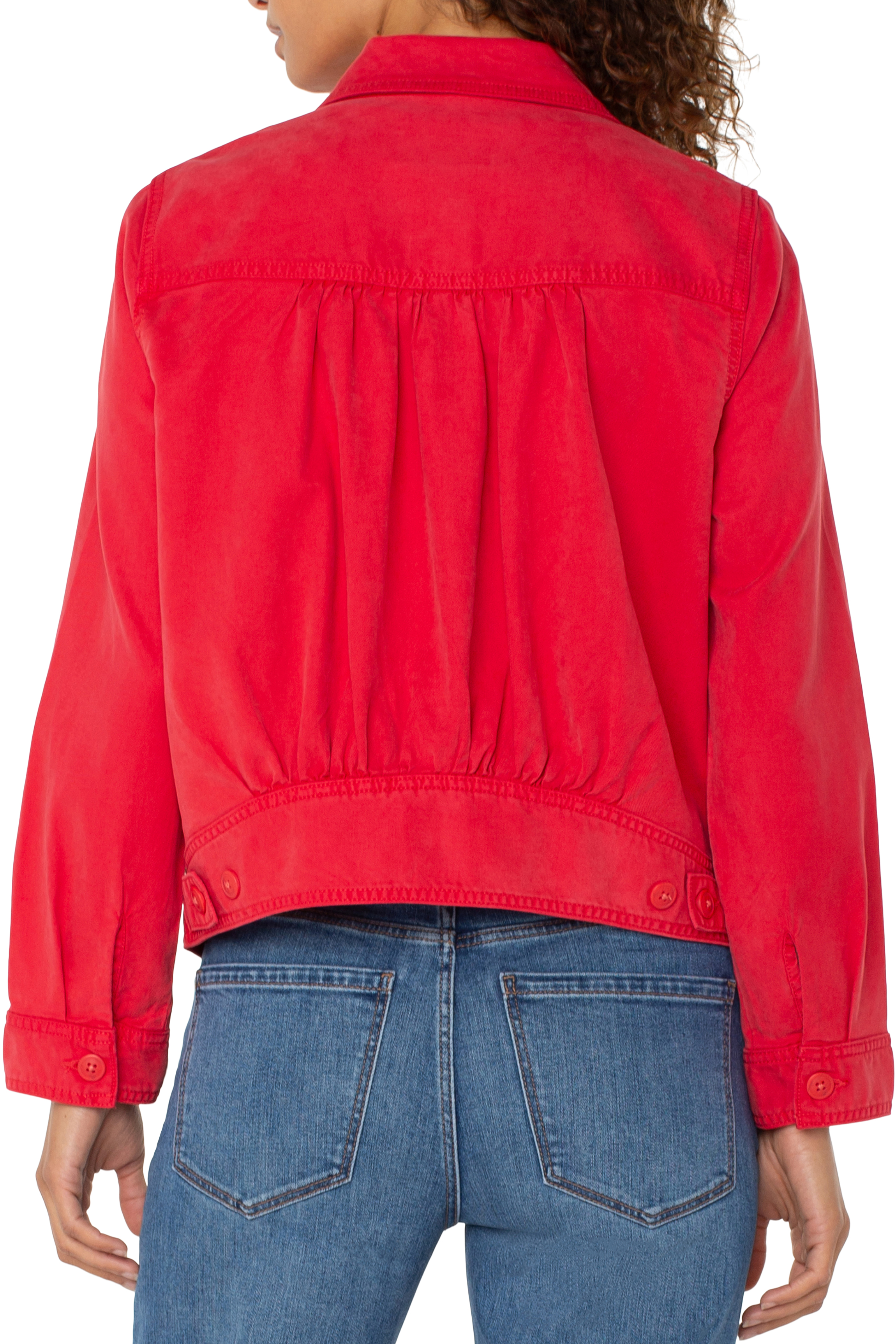 Trucket jacket with a vibrant geranium color. Shirred back for a more tailored fit. Pair with jeans, over summer dresses.