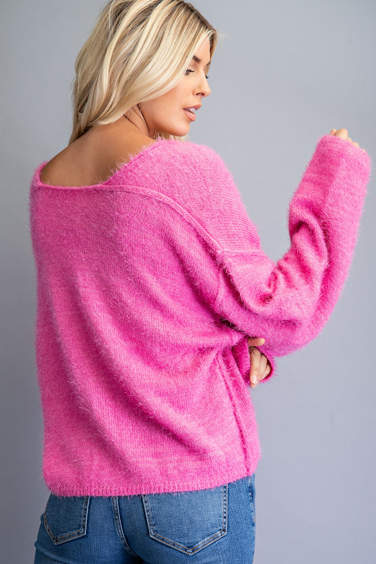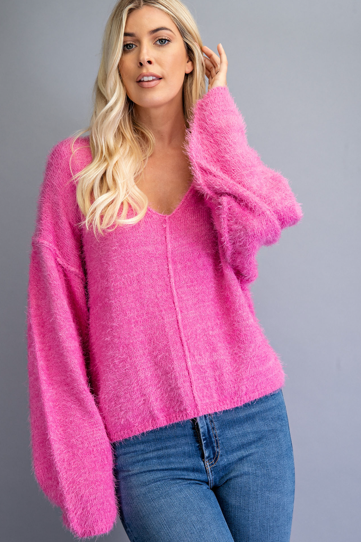 Drop Shoulder fuzzy sweater is super cozy. Looks great with denim and a lace bralette.
