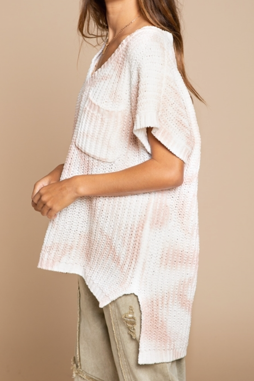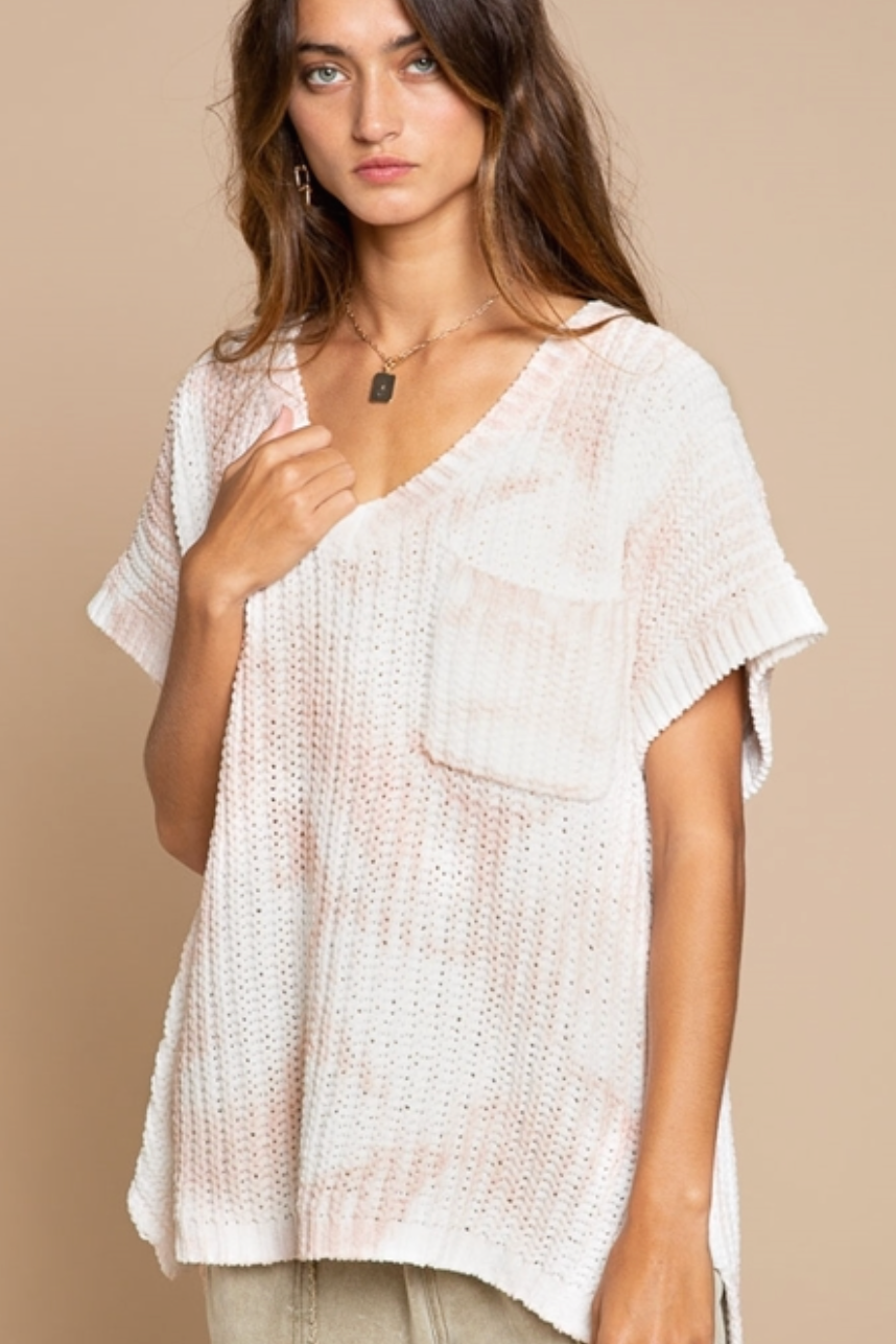 Designed in V-neckline sweater with short sleeve, relaxed fit, high-low style with side slit, chest pocket, Featured in Hand Dip Dye sweater.