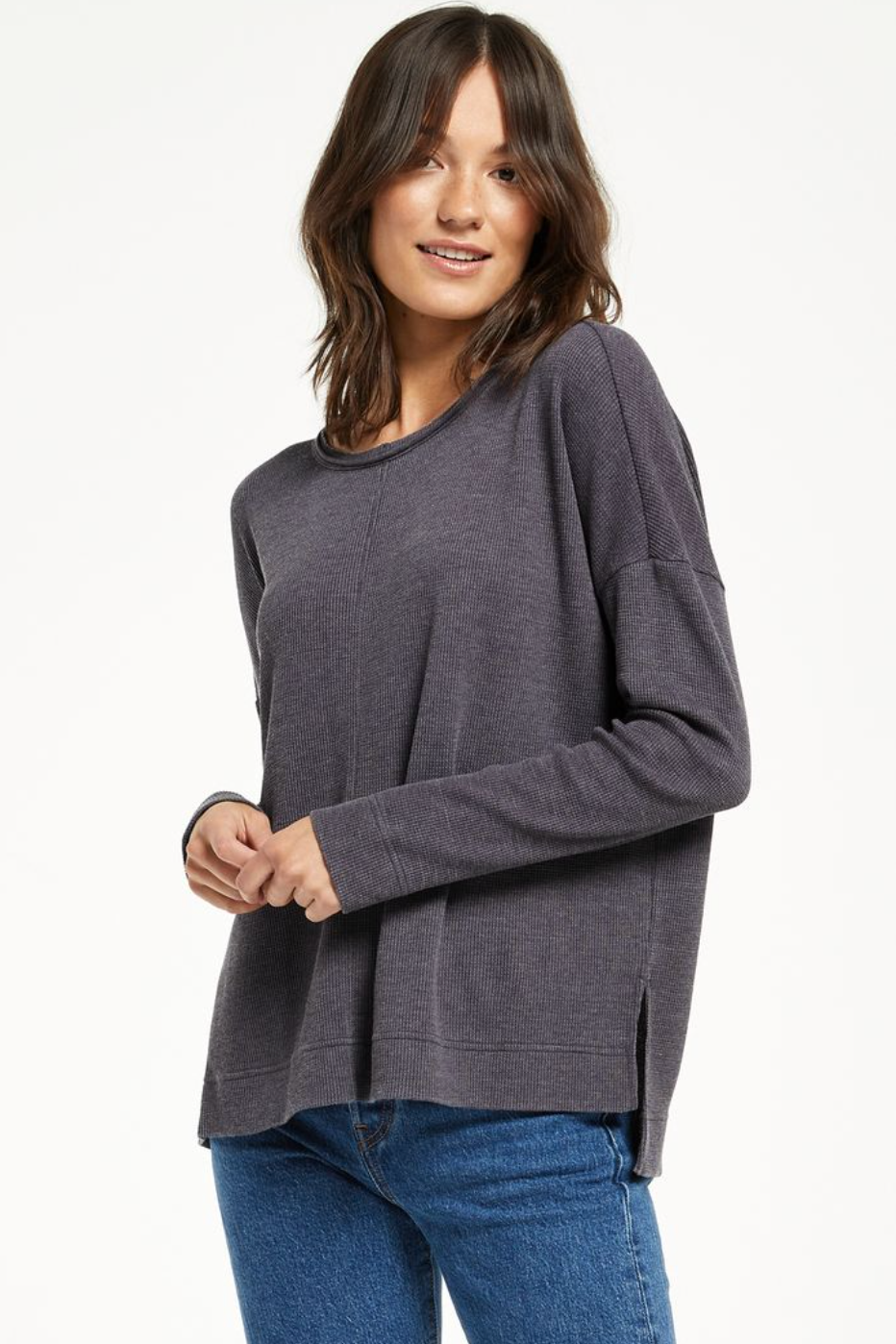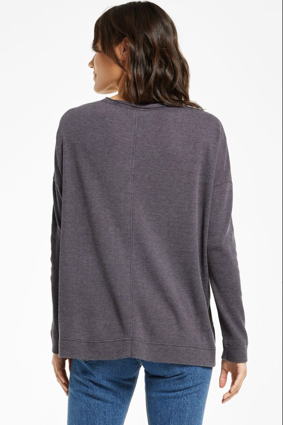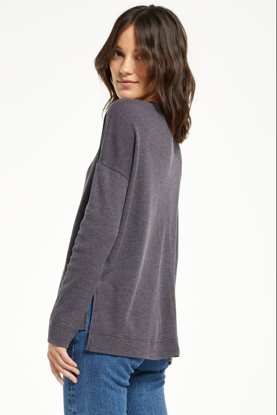 Val Thermal Top will be your new favorite top. Style details include a rounded raw edge open neckline, center and back seam, and side slits to create a flattering fit.