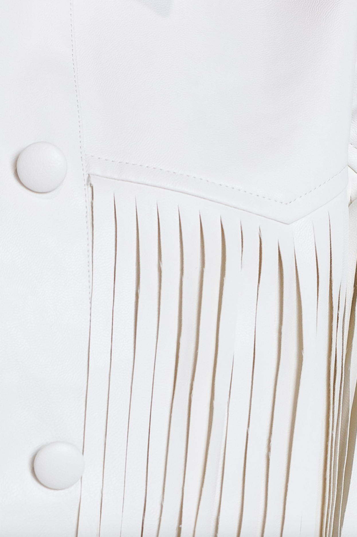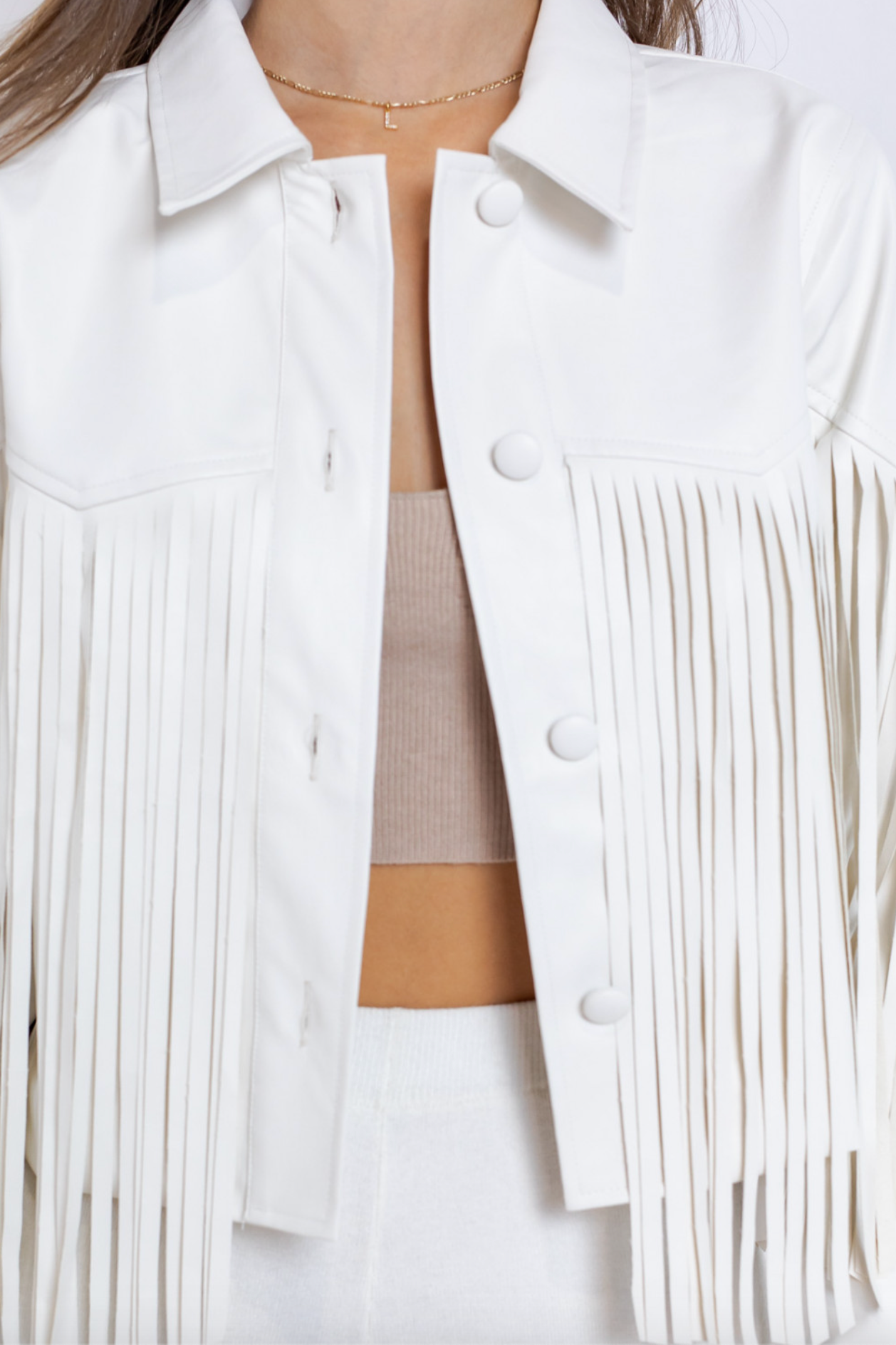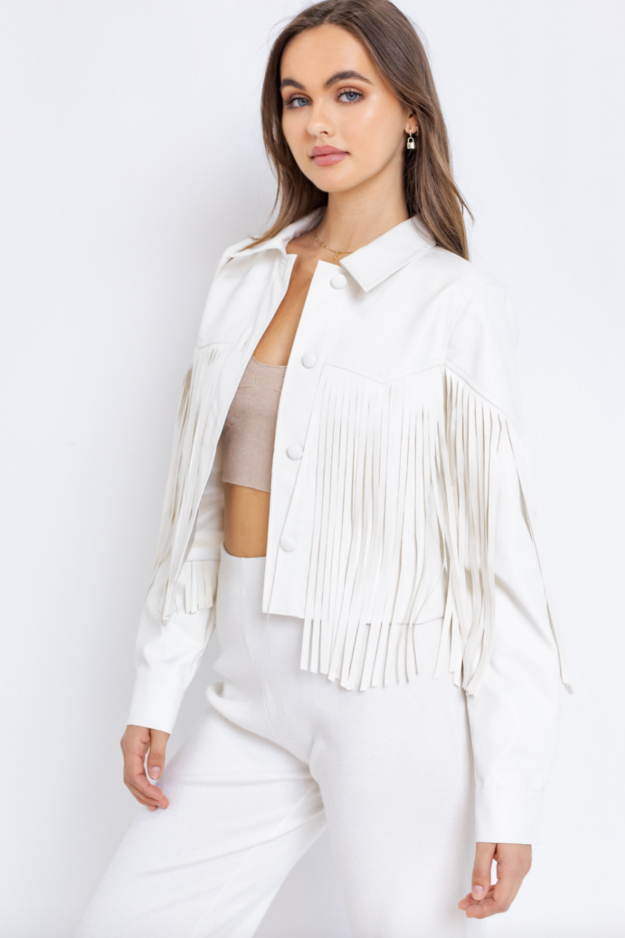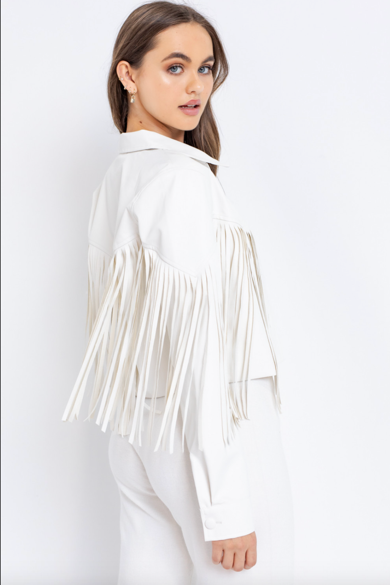A vegan fringe jacket is super fun for fall. The cream color matches any bottoms. Easy to dress up or down.