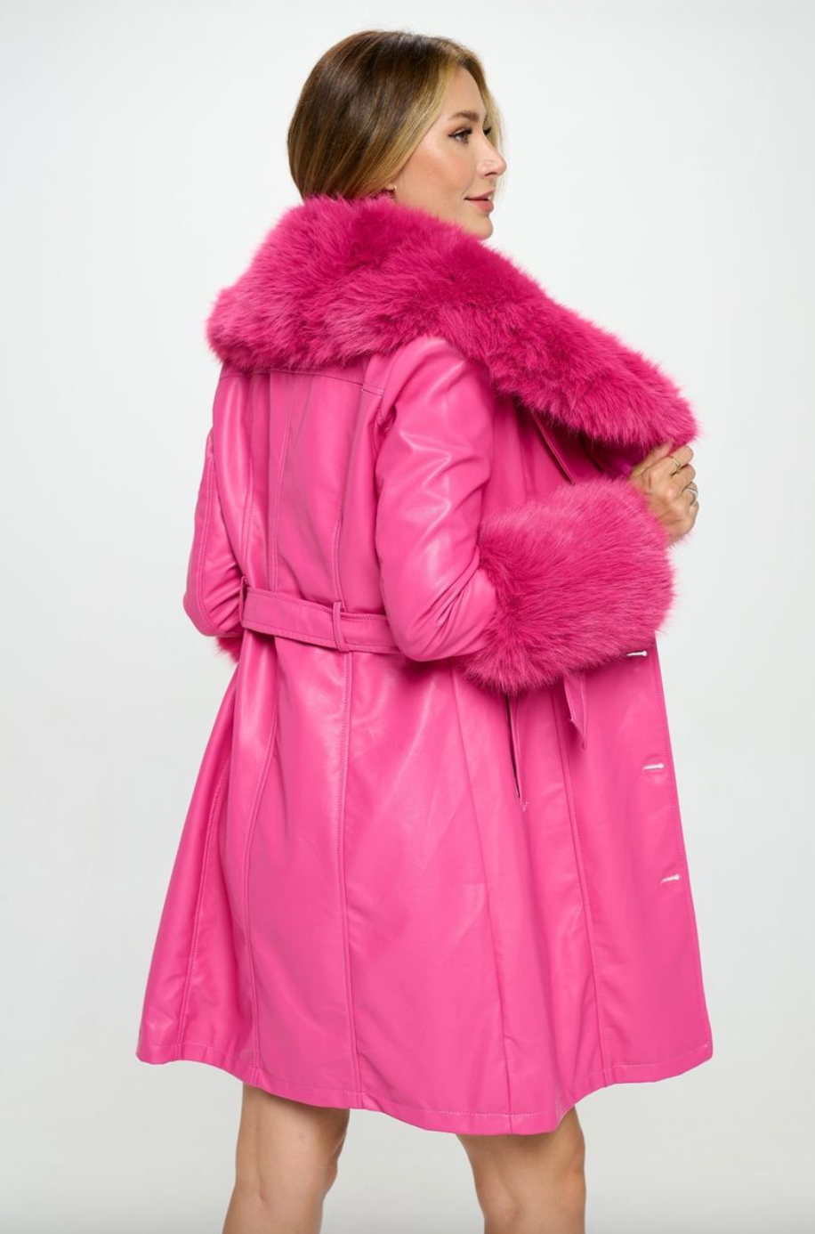 Hot pink vegan belted vegan leather coat with matching fur collar and sleeve detail.