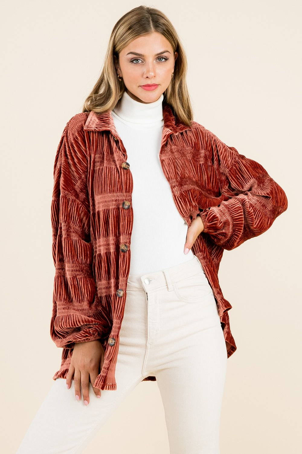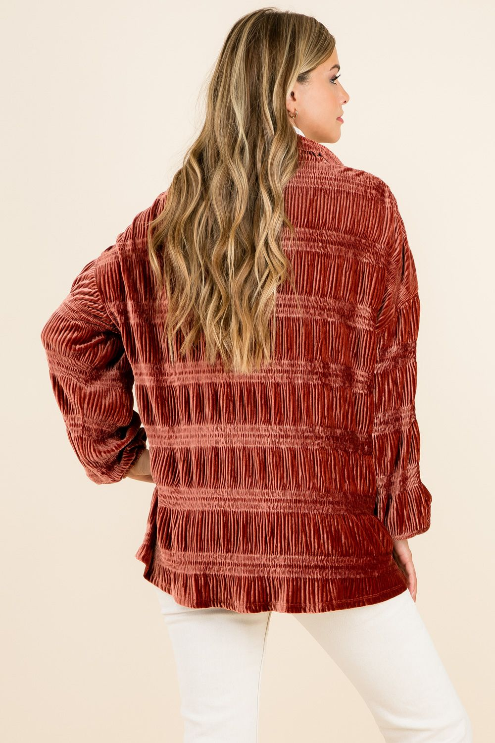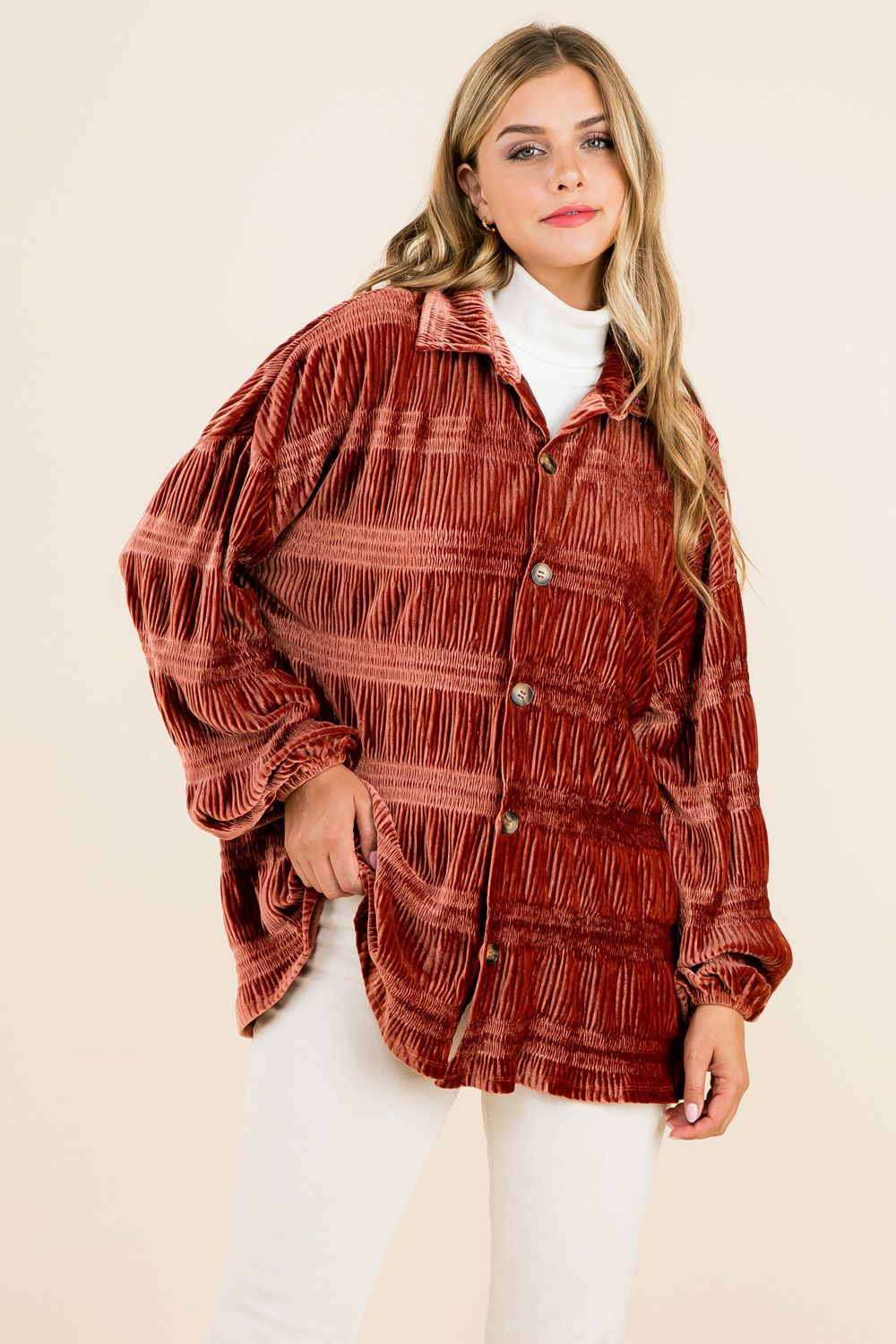 This textured velvet button down can be worn open or closed. Pairing it over a long sleeve and some fall layers to wear as a jacket. Loos great dressed up with faux leather pants or casual with jeans.