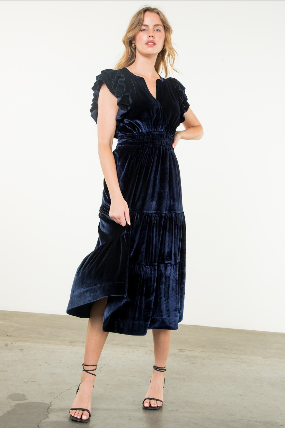 Try out a textured style such as the Velvet Tiered Maxi Dress! This dress features ruffled short sleeves, a cinched waist, and a split neckline.