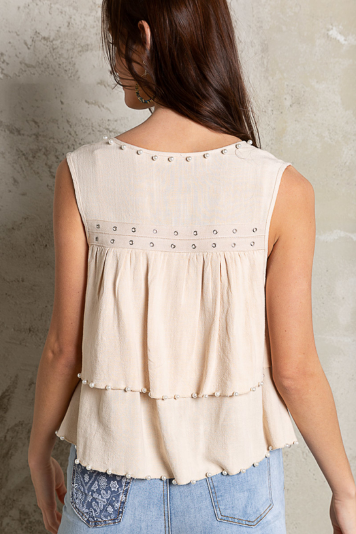 Designed in a V-neckline button-down vest, sleeveless, pearl detailing along the edge. relaxed fit, crop length. featured in a textured woven