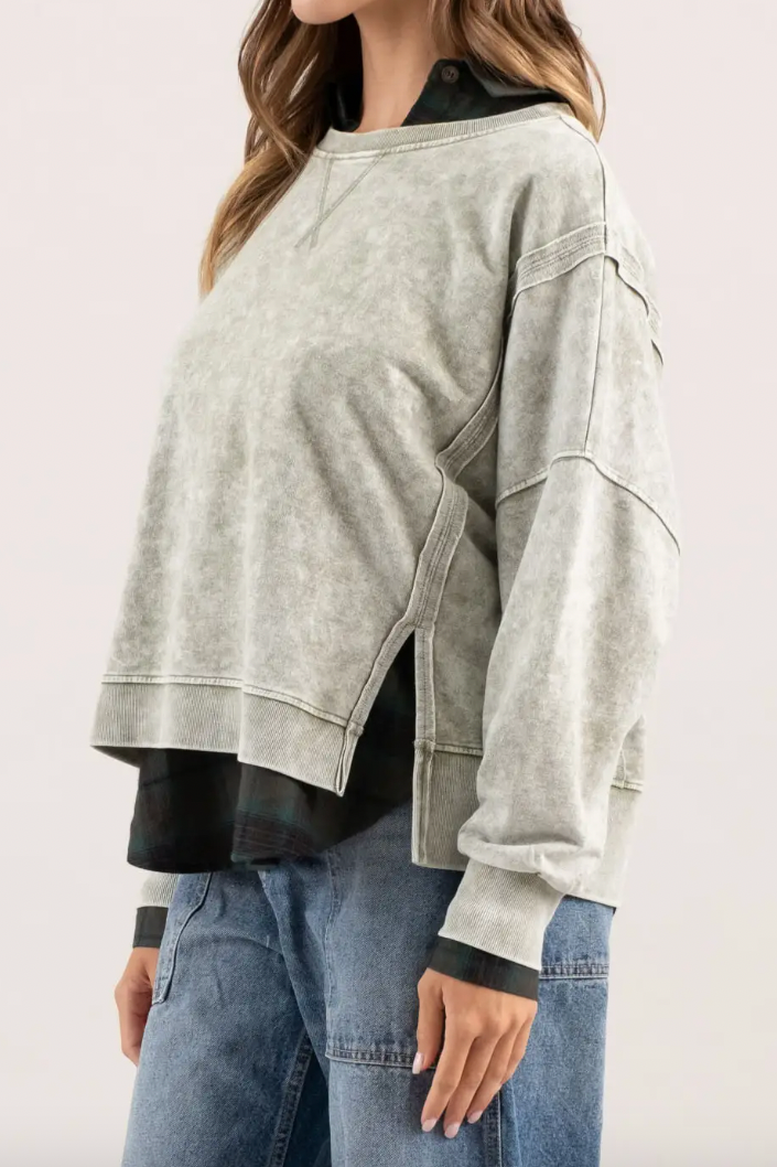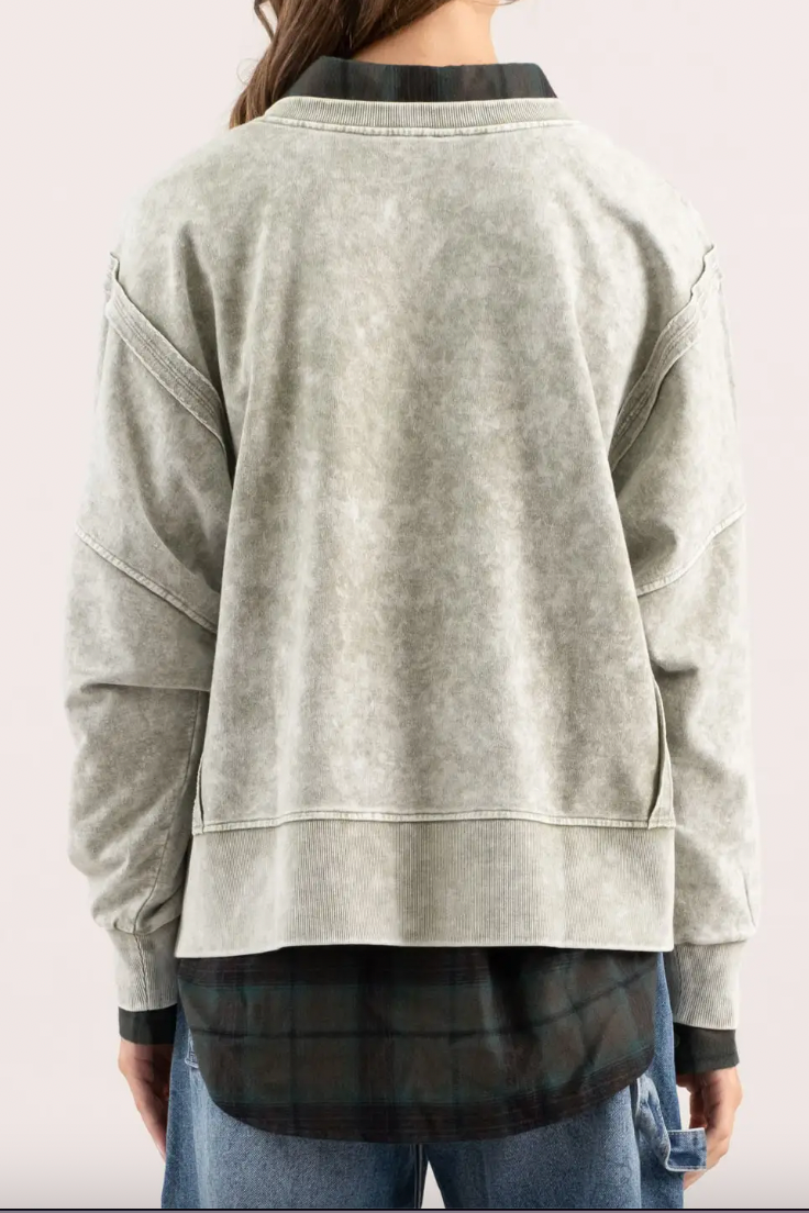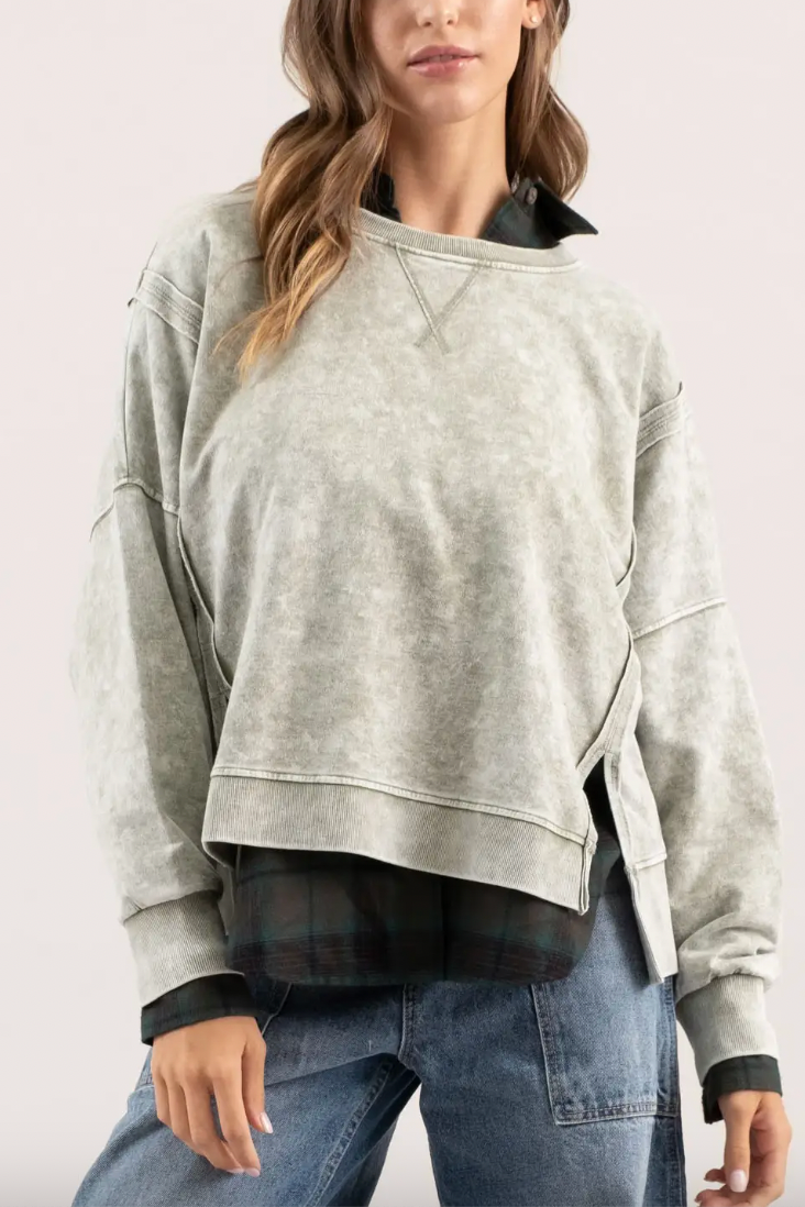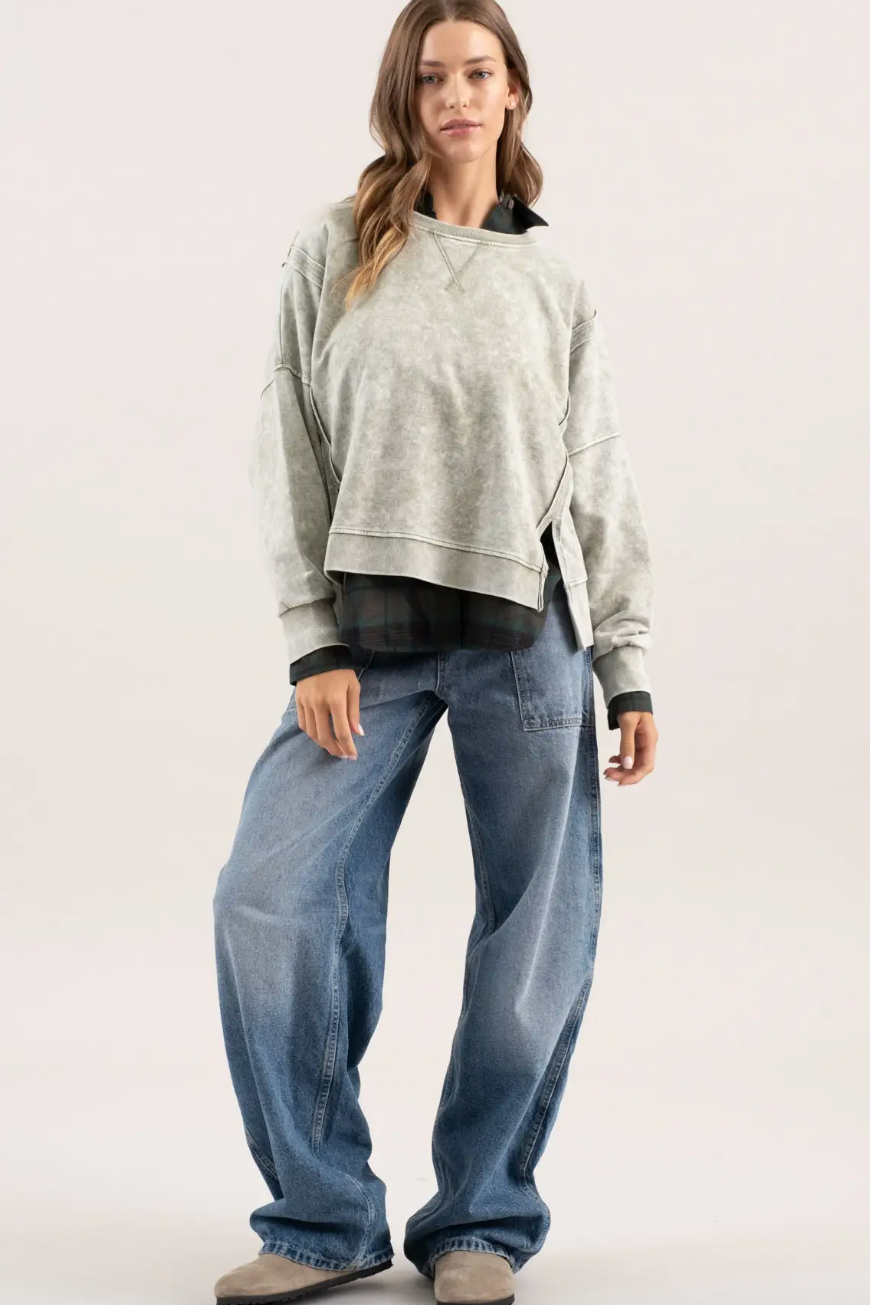 Crewneck, washed, extended shoulder. Cozy and casual.