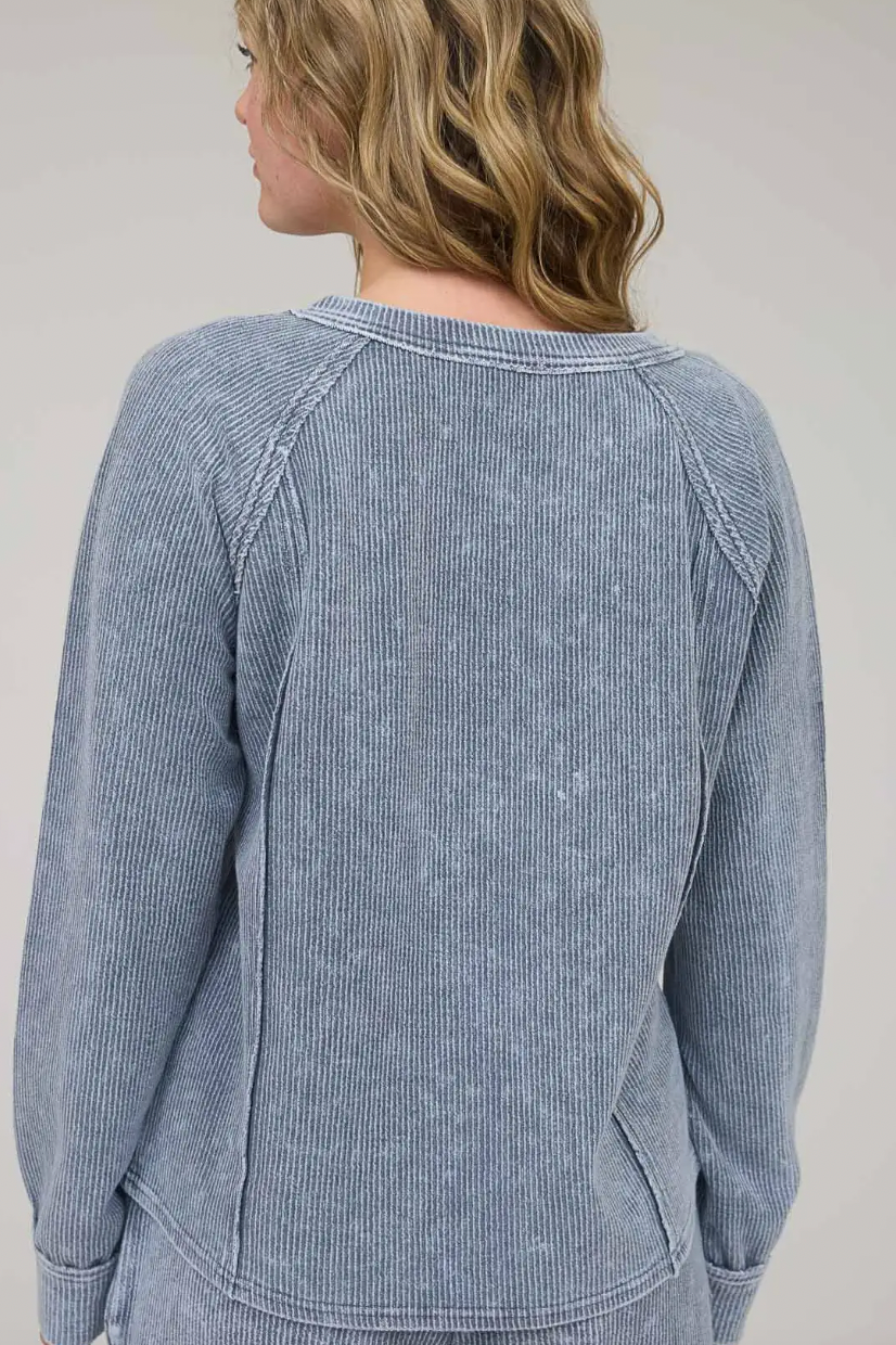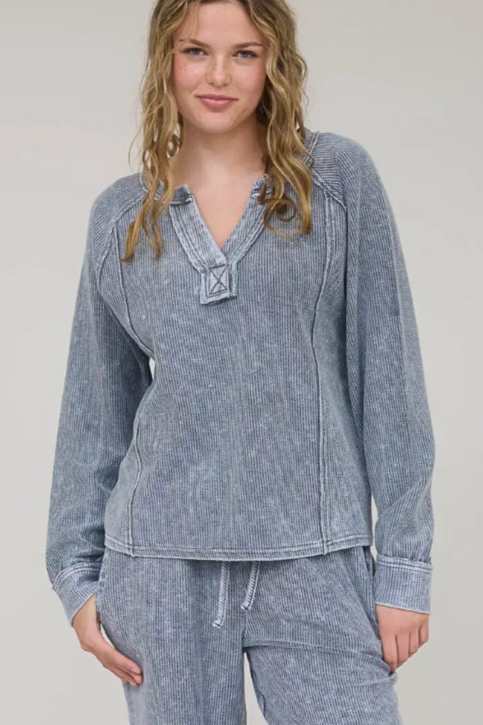 Washed Ribbed Split Neck Long Sleeve Knit Top