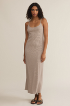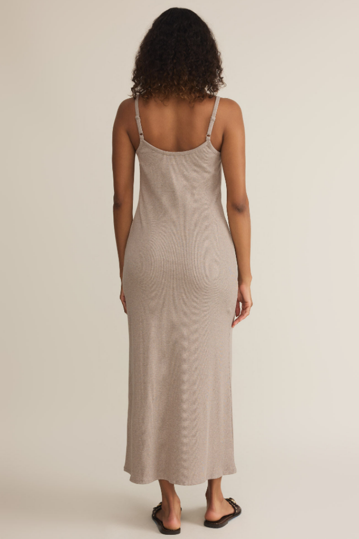 Soft and sleek, this fitted maxi dress is crafted from premium feather rib fabric with adjustable straps and a scoop neckline. Lightweight and elegant, it's a timeless wardrobe staple.