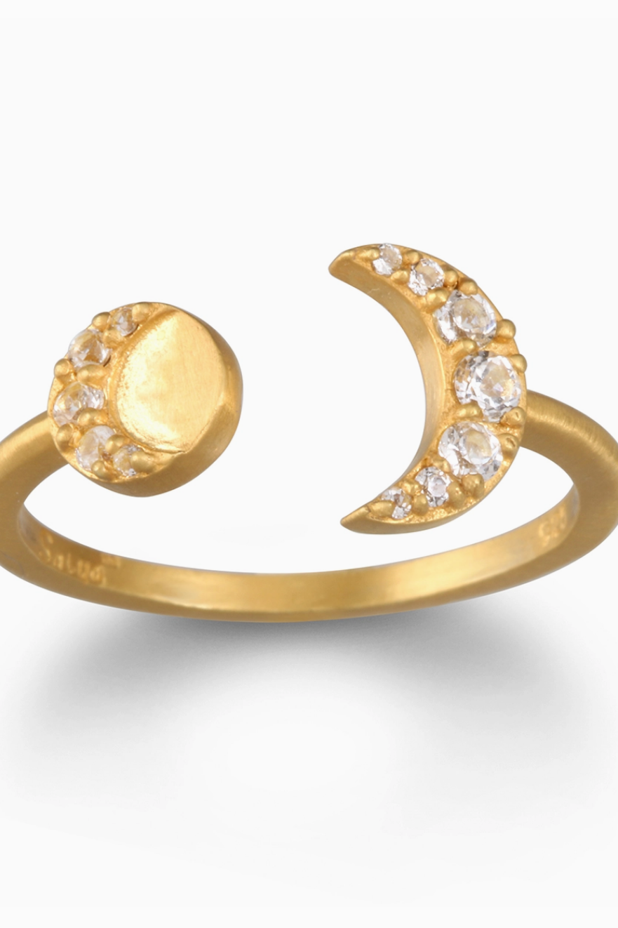 Illuminating the dark with its lucent beauty, the moon embraces its evolution with grace and glory. Two phases of the moon are accented with white topaz, stone of individuality, creativity and awareness to create an 18k gold plate adjustable ring that inspires us to welcome the beauty that change can bring.