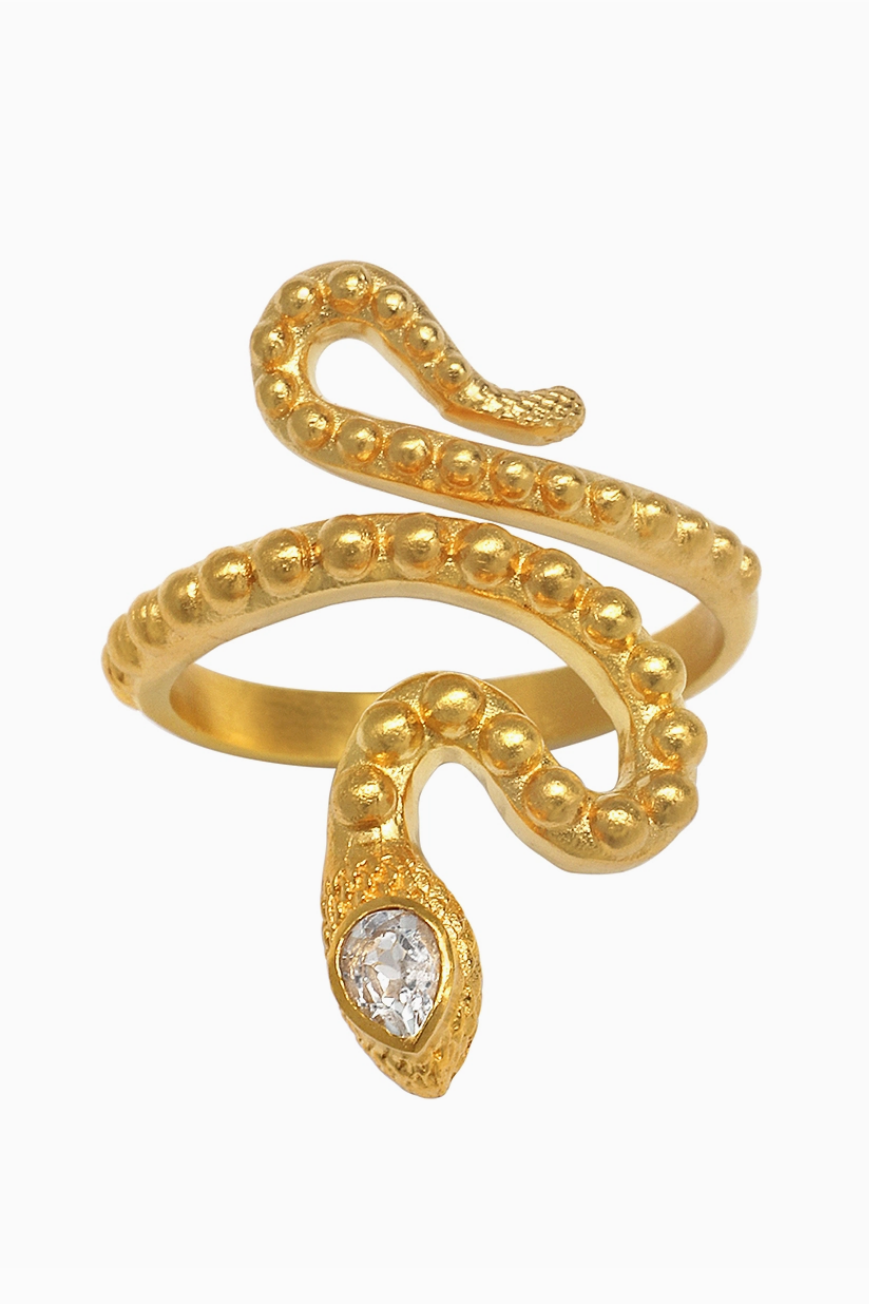 Beauty colors our experiences and elicits joy, a timeless connection between us and the world we inhabit. A gleaming 18kt gold plate ring in the shape of a serpent symbolizes energy, immortality, and eternity, while sparkling white topaz harnesses individuality, creativity, and awareness.