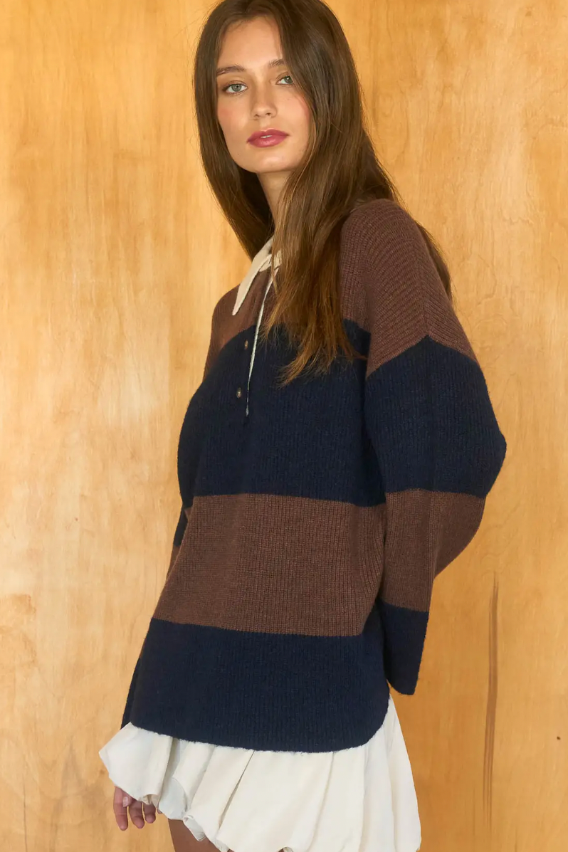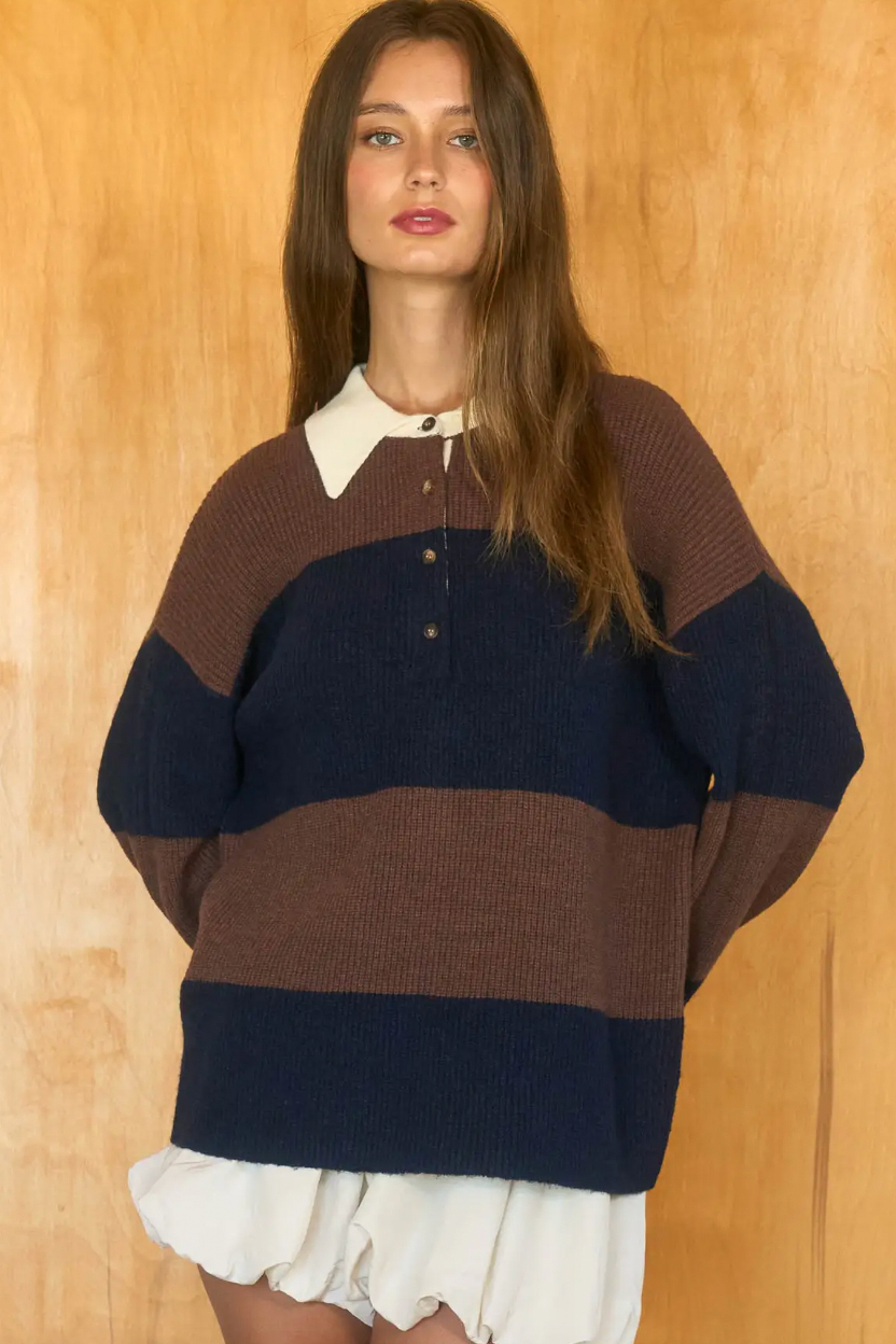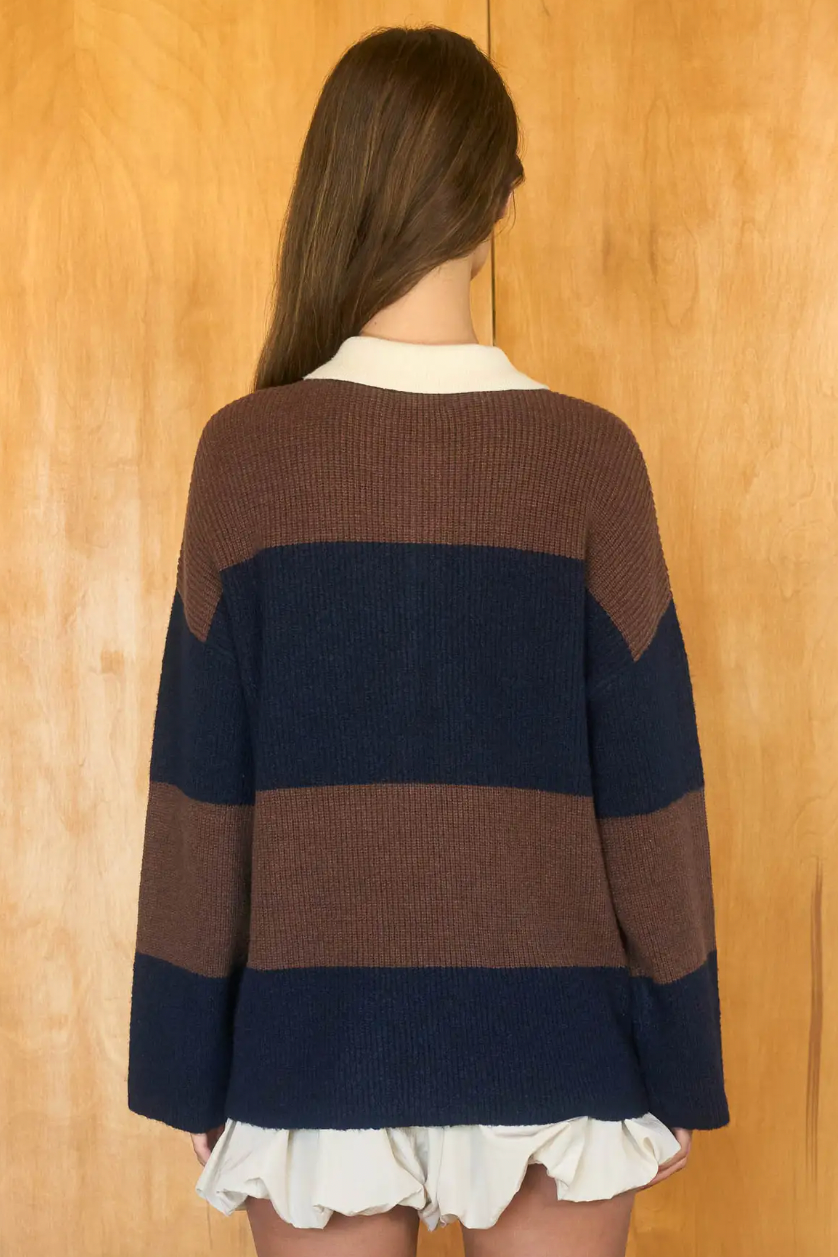 Wide Stripe Contrast Collar Long Sleeve Polo Sweater
